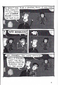 It’s always a good sign when I have trouble picking out a sample from a comic of one page strips. I generally try to pick a page that I think is funny, and when it’s an easy choice that means that there weren’t all that many laughs. This time around I could have picked a half dozen strips pretty easily. The basic setup is probably familiar to you by now, especially if you’ve been keeping up with this series: it’s all about a vampire and his crew of freakish friends. Brian posts one strip a week on Sundays, and it looks like they vary between this and some of his other series. If you wonder how many series the guy has going, check out the online store, as most of them are for sale here. Anyway, strips in here include his friend the bat and its problems, the lizard with the strange accent offering him advice, accidentally turning a girl into a vampire, the usefulness of having “divine” protection, and his troubles with ladies. Lot of strips are about his troubles with the ladies, actually, and he gets in more than a few good lines in the process. Well, he does if you’re a guy who has trouble understanding what is going on in any given woman’s head, but your opinion may vary if you actually are one of those ladies. Either way, there’s no quicker way to make funny stuff unfunny than by going through each strip in detail, so I’ll leave that sort of thing to the readers. If you liked his previous issues in this series, Brian is only getting funnier. If you haven’t liked the previous issues, you should maybe give this one in particular a try; I think you might like what you see.