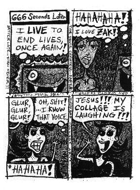 It looks like Brian actually has a continuing story going on with this series. Sure, Zeek is the same character, but there’s no clear direction of where it’s going. This one is about Cay, who apparently has to kill all things undead. He goes on about how horrible collage art is (in his trademark “between the panels” rambles) and throws in a few vampires that act suspiciously like zombies, unless of course they’re zombie vampires. Another shorty but I like where this particular series is going, and it’s cheap as the rest of them too. Check it out already, here’s the website again if you don’t feel like scrolling up…