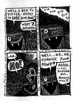 Just how many series does this guy have going at any given time anyway? Not that I’m bitching, it’s a good thing to show some range. This one is a short collection of the dreaded four panel gag strip. The first one was basically just an ad for a band and there was one on the back inside cover, so that leaves 8 gag strips. Out of those I thought 5 of them were some degree of funny, so I guess that makes this a winner! Topics include working, death, coffee, hate, and comics. If you’ve looked at the rest of this page you already know the drill for his books. If not, it’s $1, contact info is scattered over the page. See if you can find it!