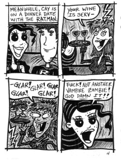 I seemed to be mildly confused in the review for the last issue as to why so many of the pages seemed to end in bad puns, and in retrospect it’s simple enough: these were done as daily online strips, one page each. Naturally that means there has to be some sort of payoff on each page, and this is where my traditional dislike for the four panel strip comes in. Luckily this issue tells a decent enough story on its own. It’s still all about this sad vampire wandering around, trying to find love, and this issue also has said vampire running into a variety of zombies, the bat and lizard from the previous issue, a brief girlfriend resulting from a blind date (more about this momentarily), a new pet, and Death. This brief girlfriend had a few moments where it seemed like pages were missing, I guess because this book doesn’t print all of the online strips, maybe because some of them didn’t make the cut, or maybe they just refer to things that happen off-panel. Comics can be tricky that way. OK, thanks to the wonders of the internets I was able to just go over to Brian’s website and it looks like plenty of the pages in this book aren’t even posted there, so the missing pages will remain a mystery. By now you’ve seen enough of Brian’s work on this page alone to know if you like the guy, if so, you’re sure to love this one too. If you’re undecided, maybe start with a little Zeek or check out the website first, you know the drill. $3