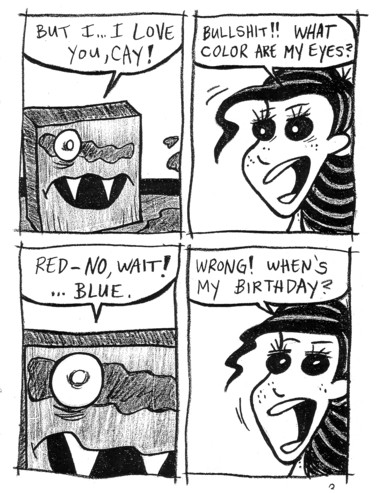 I think I’m finally starting to get a feel for these comics. I was a little bothered by them at first because they’re so short that they offended my delicate, pre-conceived notions for what a comic should be. Now I see them as somebody sending me a couple of jokes in a little pamphlet with a short story holding it together. This marks (what looks like) the end of the Cay series, as Cay confronts the living piece of collage art and the two zombie vampires. This smudgy art has really grown on me as I’ve seen more of Brian’s work. The smudgy lettering, however, has not, although I do appreciate the occasional filled-in word. It’s $.50, like most of his comics, and you should probably get the lot of them, as it’s an ongoing, complete series. You’ve been here often enough now to find the contact info, I expect…
