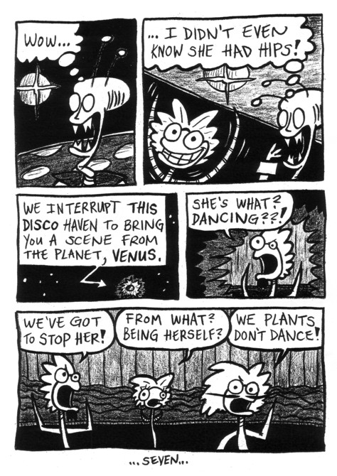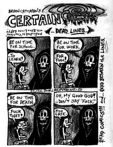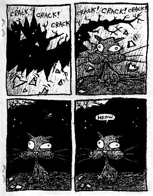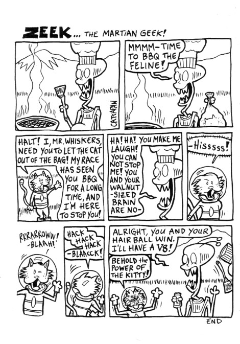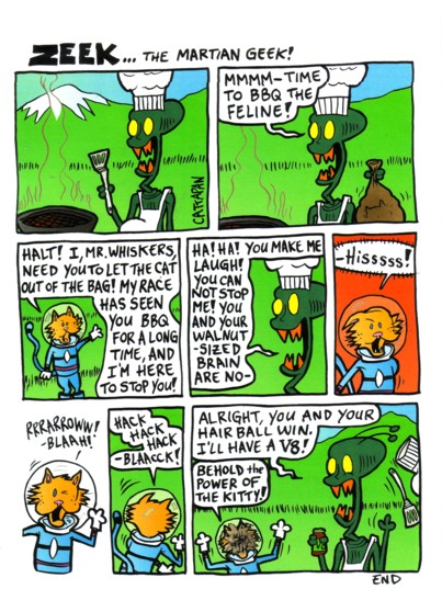It’s about time he put out a full color book! Don’t get me wrong, usually I bitch about the cost of doing a mini in full color (to the artist and to the people who have to buy the books), but if there’s anything that screams for full color, it’s Zeek and his wanderings. In this one we finally get to see Mars (and why Zeek never seems to go there), Zeek tries to meet some earth women (then settles for videos of Winona Ryder), and Brian fills in the rest with assorted one page strips. I didn’t notice that the sampled page was one I used for an earlier issue, and I’m also not sure how much of this was already in older issues. It mostly seemed new to me, but I read many hundreds of these things every year and my memory for specifics is lousy. Either way, if you like his stuff, it’s never looked better than this. You can even compare color kitty strip down here to the black and white version above if you don’t believe me. Of course, if you’re new to the Cattapan universe and just want to check him out, chances are you’re better off working your way through some of the cheaper minis before buying something for $5, but I’m not the boss of you. $5