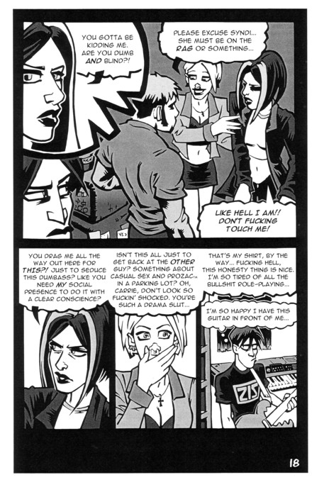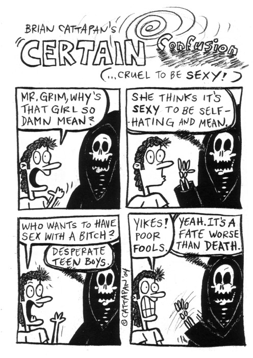 In my eternal wishy-washiness, I always go back and forth on the mini comics: which is better, one big story per comic or a bunch of little ones? Both have their advantages, sure, but I’ve finally settled on one thing (today, anyway). I’m a big fan, with work that is new to me, of the multiple story format. It allows a much better chance to get a real feel for the talent of the people involved, instead of letting everything ride on one big story. This one has a few different stories, some funny, some not so much. First there’s an intro page, in which we get to see the writer (Matthew) as a bum and the artist (Lonnie) as an alien, and we get a brief intro of everybody else in here. The first big story here deals with life working at a gas station, talking shit to the neighboring gas station and making fun of fat people. It’s funnier than it sounds, trust me, but they go a bit overboard on the fat people. Hey, it’s America, we’ll all get to that stage, unless our hearts explode first. Next up are a few short pieces with the most useless character in the book, a mostly naked cat lady. Mostly naked, you might be saying. That doesn’t sound so bad. In theory, sure, but they milk this of any potential comedic value in three short pages. Not too many places left to go from there, and I have this cynical, sad feeling that she’ll be a money making sensation for these two in five years. Then we get to the highlight of the comic, in which the friend of a young woman lets her have it for dragging her out to be with a pair of musicians when it’s not exactly like said young women would need any help getting into their pants. Following all this is a series of short pieces (one each by Brian Cattapan and Pelcher also), mostly landing on the “funny” side of that great, subjective cosmic scale. All told it’s worth a look if you appreciate juvenile humor with some genuinely funny bits thrown in. $2