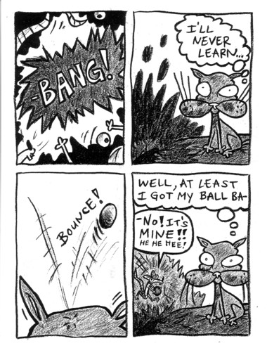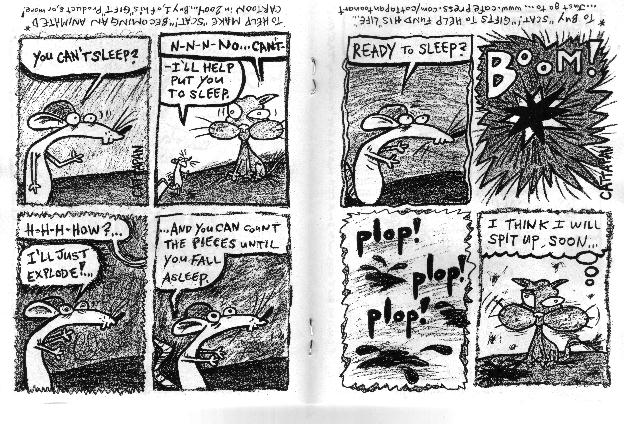 This man puts out the tiniest books ever! Not in terms of actual comic size, as Caesar Meadows holds that record I think, just in terms of the number of pages. I feel bad putting two pages up for sample here, as that’s about half of his book (you probably think I’m joking), so go ahead and send him a couple of bucks for some comics to alleviate my guilt. This is a tiny comic about a cat who’s too afraid to fall asleep and gets help from a rat in a very odd way, which you can see from the sample. It’s only $.50, meaning that you can get 6 comics like this for $3. What a deal! A funny book, mostly because that’s one of the better cats I’ve seen in comics. Oh, and Brian was kind enough to inform me that he uses prismacolor pencils for his comics, as inspired by Bill Plympton. Not a bad man to be inspired by, and I have to admit it looks damned good in this issue, it’s just that sometimes (what with the small pages and all) it gets downright messy.