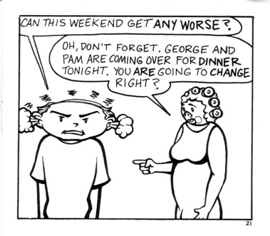 I’m supposed to be talking about the comic here, aren’t I? Sorry. Castration is about women and , as the cover says, “why we love them and hate them”. One story by Mike Tolento and one by Sam Stern. Mike’s is called Artie’s Last Weekend and it’s all about a middle-aged man and his weekend. What he plans to do with it, what he ends up doing with it and how he deals with. Maybe my favorite of the books that he sent to me, although they’re all so different that it’s really hard to tell. The Sam Stern story (untitled, apparently) is about a man and his total bitch of a girlfriend. One of the better punchlines that I’ve seen lately at the end of it and a good short tale all around. It’s $1, just buy it and enjoy.