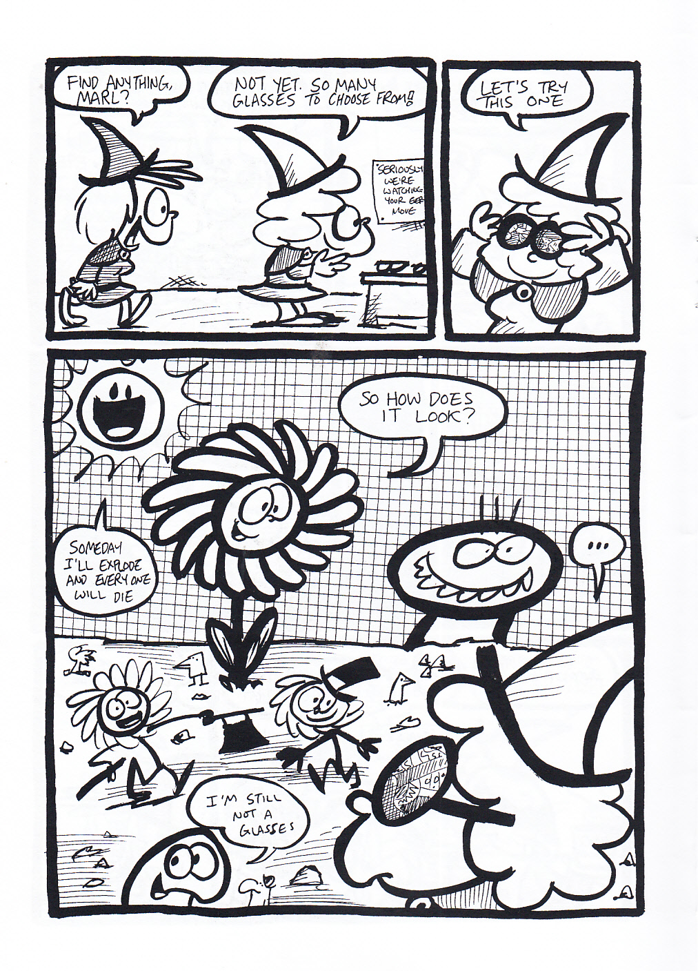 Hey, wait a minute. I thought these comics by Charles were entirely for kids. Are kids able to see “hell” as a curse word now? Have I been confused all along? Or am I overthinking this whole thing? Yeah, I’m guessing it’s the last one. In this issue, Marl gets her glasses broken and has to get a replacement pair. Sounds simple enough, right? Well, you’re reckoning a world without magic, as the gang goes with her to pick up replacement glasses and runs into all sorts of shenanigans. The glasses each have different abilities or let the user see the world in a variety of different ways. Some are funnier than others, but I’m not going to go through all the options and ruin the fun for you here. There are also a couple of “ask a cat” strip at the end, as is required by law. Oh, didn’t you know that I passed a law to make that mandatory in his comics? Yep. Could have solved all sorts of problems in the country, sure, but I focused instead on increasing the number of cat stories in his comics. Eh, I still think I made the right call. All in all it’s another comic full of good clean fun (except for the one mild curse word that scandalized me so), if that’s the sort of thing you like you should check this out! $2
