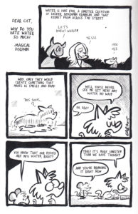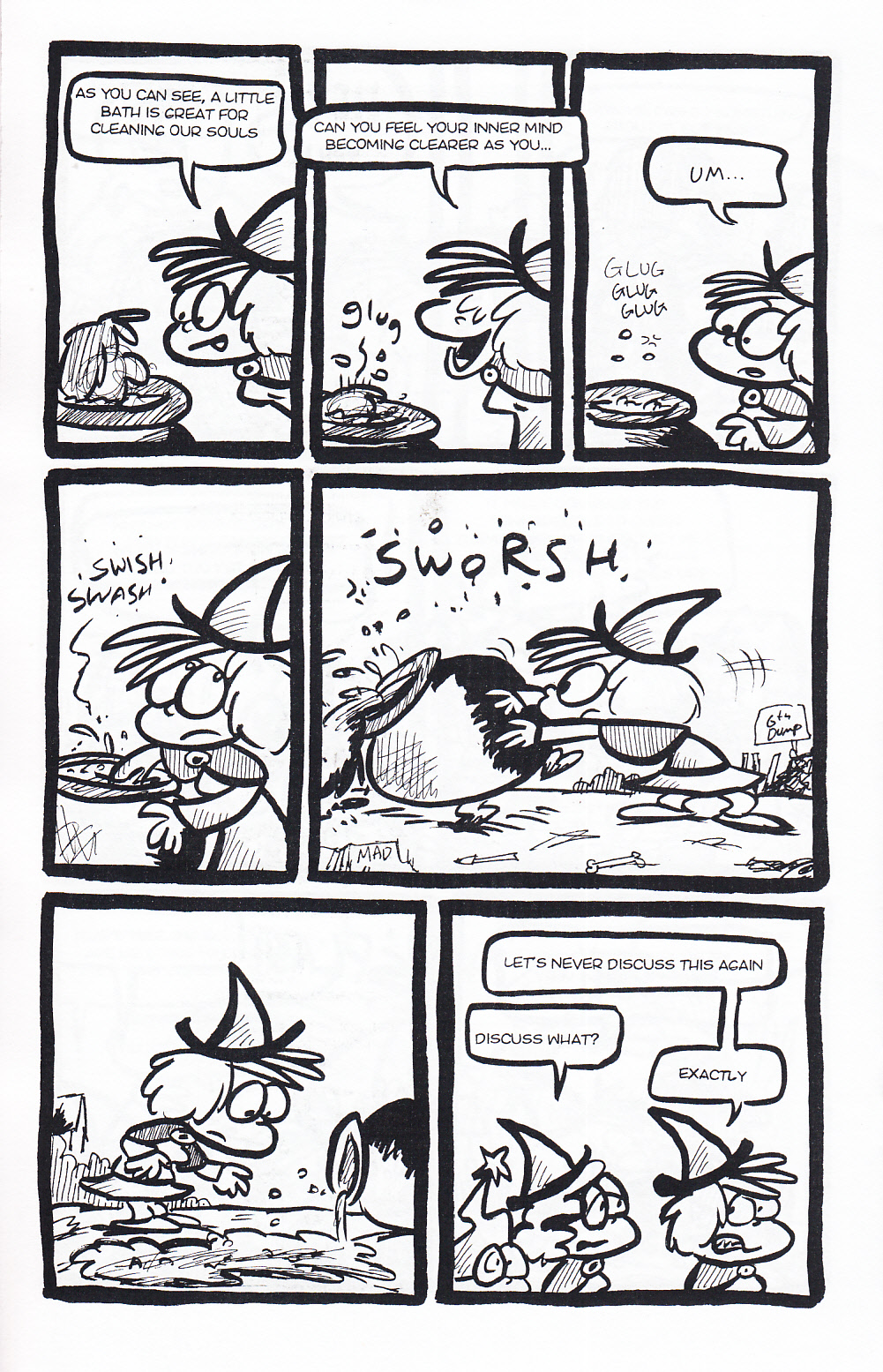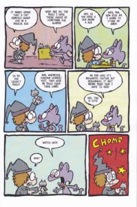Aw come on Charles, don’t sell yourself short! Your comics are delightful. Yep, that’s right, I’m starting off the review by talking back to the comic cover. That can’t be a good sign. This time around is another collection of short pieces (almost exclusively focused on cats, meaning I’m on board) and one longer piece. The longer piece started off slow but won me over with the page that I’m using as the sample, even though it may just slightly spoil a bit of the proceedings. Basically the gang is flying low, one of them says maybe they shouldn’t fly so close to chimneys in case the broom catches on fire, which naturally means that the broom catches on fire. This shouldn’t a huge problem, as they can just use magic on any old broom to fly home, but they have unfortunately managed to land in a town of hobos. These are stereotypical old-timey hobos who are basically like Pigpen from the Peanuts comics, not actual real humans who don’t have homes. An important distinction in a funny comic! Anyway, these hobos don’t even understand the concept of cleanliness, so it’s not possible for them to get a broom, but they do hatch a plan to get the inhabitants of the town more naturally interested in cleaning themselves. It goes nowhere, a second (and more morally ambiguous) plan is formed, and that’s about as far as I can dig into it here. It’s a fun story, I will say that. As for the shorter pieces, they deal with cat questions such as what’s in their dreams, what’s their problem with water, where did the nine lives thing come from, why no love for Benjamin Franklin, what’s in that box, and why do you ask for belly rubs even though you clearly don’t want them. All solid questions, and all of interest to cat people such as myself. If you hate cats you’d probably still find them funny, but if you hate cats I can’t really put myself in your shoes, so I don’t know what goes on in that head of yours. It’s another solid comic all around, and still a deal at $2.