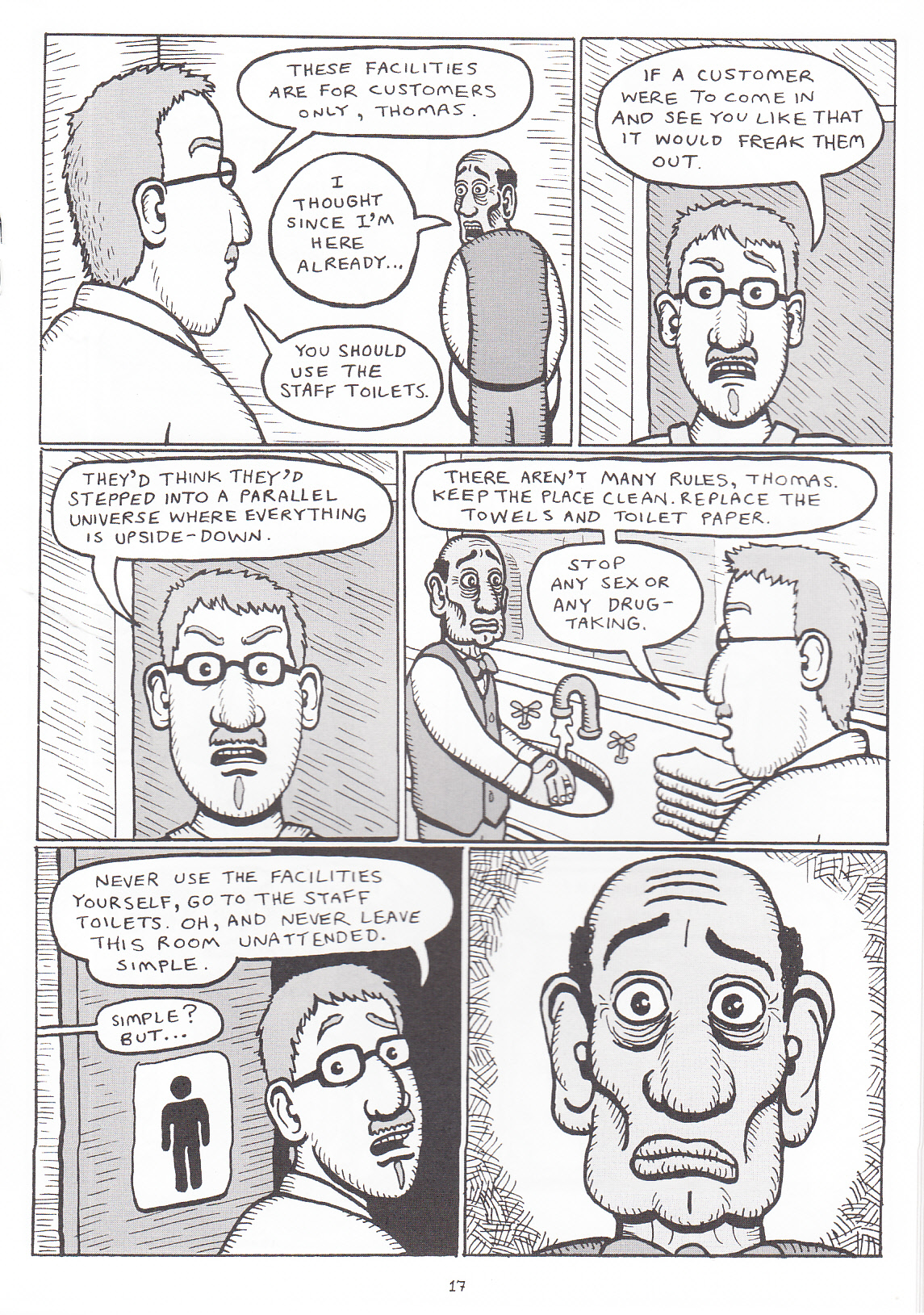 Oh, the life of a bathroom attendant. If you’ve ever seen one in real life (or even in a movie), chances are you’ve thought about what life must be like for them, how they ever ended up in such a job. Well, this one doesn’t get into any kind of an origin story, but it does paint a grim picture of what life is like for one fictional bathroom attendant. If you’ve never even heard of such a thing, the cover does a good job of showing the basics. It’s one gentleman, impeccably dressed, who’s on hand to offer towels, mints, and cologne after you finish doing your business. Ladies, is this a thing for you too, or does this only happen in upscale men’s rooms? Just curious. Anyway, the list of rules for our hero is simple, and mostly involve keeping everything stocked and clean. There’s also the frankly inhuman rule preventing him from using that bathroom, instead forcing him to use the employee bathroom. While also never leaving his bathroom unattended. Yeah, it does seem specifically designed to break the guy. Anyway, he puts up with all sorts of indignities throughout the day, only getting through it via his rich (if disturbing) fantasy life. It’s a darkly hilarious book, and if nothing else reading this should guarantee that you leave a tip for the poor guy if you ever see one of these attendants in real life. Their life is hard enough already, the least you could do is throw a few coins onto their tip plate/jar. $5