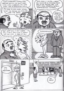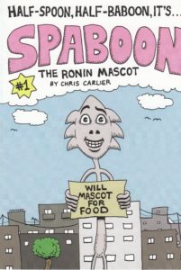 Any questions you might have had about that title were taken care of on the cover: Spaboon is half spoon and half baboon. What more do you need to know? Plenty, as it turns out, but have no fear, this comic will answer all of your questions! Except maybe for how he came into being, but if we’re lucky #2 will be an origin story. This comic seems to have come about because of Chris’s fascination with mascots (I included a link to his website about mascots because it’s amazing) and it tells the story of Spaboon after he is fired from his job as the mascot of a large corporation. They merged with another company and decided to stick with the other mascot, a large capsule named Capsuro. Spaboon runs into him as he’s getting fired, a brawl ensues, and some local protesters mistake this fight as a sign that Spaboon is on their side in protesting this corporation. Plans are hatched, Spaboon is introduced to drugs, and a raid is conducted at a testing facility. This goes extremely poorly, but we do get to see a lab with some rejected mascots in it. I’ll leave the rest of the story to the readers, because I’m assuming I had most of you at “half spoon, half baboon.” It’s funny and disturbing, with just a dash of social commentary thrown in here and there. Me, I’m just hoping this is the first of many comics about mascots, either entirely centered on Spaboon or each featuring different mascots. There are so many to choose from, not the mention the horrors that could be made up entirely. $5
