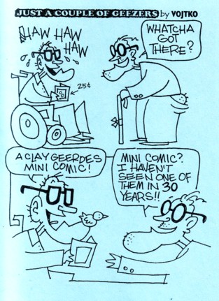 It’s sad that it’s just now occurring to me that I should have read this series in order. Oh well, live and learn. And forget, and repeat the same mistakes. This is the issue where Dan explains his plans for this series, basically that he’ll put out the 8 page comic every time he has enough art to fill it. It started out as a tribute of sorts to Clay Geerdes, someone who was active in the 70’s and 80’s and was instrumental in getting the word out about all kinds of mini comics. The first story (by Jim Valentino) in here tells the story of Clay for those of us who are culturally illiterate as to how the mini comics “movement” started. There’s only one other piece in here, a two pager by Bob Vojtko of two old geezers pining away for the old days when they could make mini comics. The love for Clay is palpable here, it makes me wish I had actually seen something from the guy. Actually, chances are that in the piles of minis around my house there must be something with work from the guy in it, but I have no idea where that would be. Kids, you should read stuff like this, get a little sense of history. And for those of you old enough to remember the early, early days of mini comics, well, a little nostalgia never hurt anybody, right?