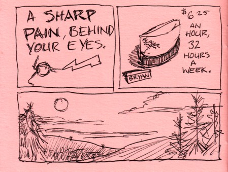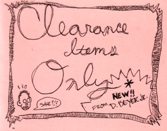 More randomness from David, as this issue is a collection of “clearance items”, invented or seen as he was walking along, who knows? Items in here include a used dildo, a dinosaur bone, cynicism, a used birthday candle, and many other fabulous items. It’s done in a loose sketchbook style, so if you like your art neat and perfect your delicate sensibilities may be offended. It’s a funny mini though, and what more can you ask for from the shorties like this? $1