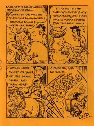 I hope nobody out there is trying to read these reviews sequentially. Once again, I read them way, way out of order, although now that only #3 is left to review I will be reading #2 and 3 in order. Whoopee! This time around the comic is half one-page pictures, meaning no story of any kind for those bits. In order, for the curious, those are an interpretive blot by Bill Shut, something utterly fantastic by M. Roden, a real mystery by… somebody (seriously, is there no space for some sort of tiny table of contents?), and a monkey with Frida Kahlos by Jim Siergey. You could take those or leave those (although I particularly enjoyed the Frida Kahlos), but then there’s still the comic story to consider, and it’s fantastic. It’s a three page tale by D. Miller about a burned-out artist trying to come up with fresh gags for a magazine about tits, dicks and balls. Comic versions of tits, dicks and balls anyway, and this artist is at the end of his rope in terms of being able to come up with anything else remotely funny. It’s a great piece and makes the whole comic damned near unmissable. Check it out, or go nuts and just get a pile of these cheap things.