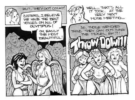 More tiny fun from Dan Taylor, this one a wee tale of the history of Muses and their troubles with Sirens way, way back in the day. It’s hard to do dig too deeply into these tiny things, and it’s a fun little light story, if you want to leave it at that. So naturally, I’m going to start picking. Typos always bug me, and even more so in little books like this (where there’s so much less to proof than, say, a graphic novel). In this case it’s even an italicized word (“Godess”), so it’s hard to see how it could be missed, but still a minor thing that most people probably just gloss over. Also, while the second half of the story looks gorgeous, bits of the first half (like the eyes on the Muse on page 3) look rushed and a bit sloppy. Just my two cents, as always. It may be a bit sloppy at times, but it’s still fun, so there are certainly worse things in the world. $1