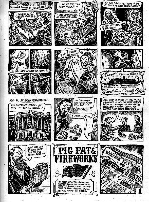 You know, I would think that historical comics would be pretty boring things. I don’t think I’ve seen one yet that has been dull, maybe it’s just latent memories of school or something. This is the tale of the beginning of iron battleships when they were used in the Civil War. He uses all kinds of references and has a great ear for realistic, old timey (I know there are better words to use, I just wanted to say “old timey”) dialogue. What makes it fascinating is that nobody actually died in the battle he depicted, as both of the ships were evenly matched. Great art and it’s pretty much a history lesson, which is the kind of thing that you don’t get much in comics. Go here, or to the Catastrophe page to see all of this comics…