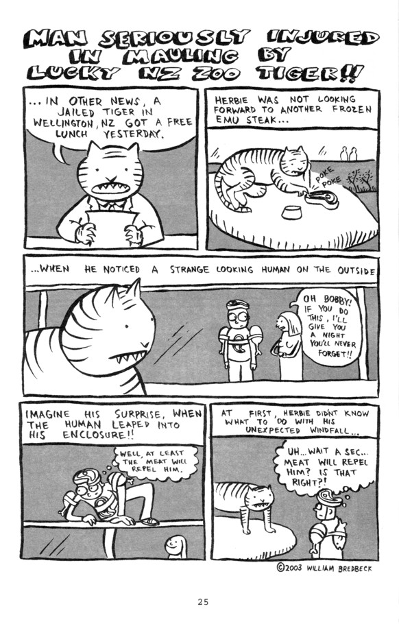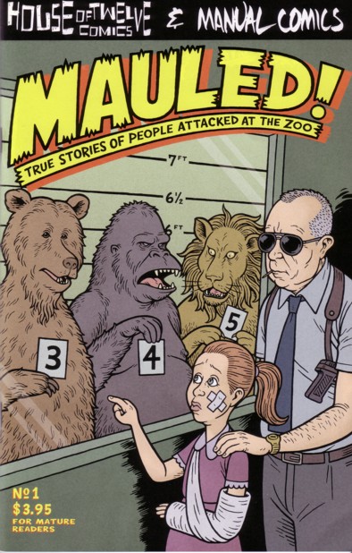 In case you can’t read the cover, it says “True Stories of People Attacked at the Zoo”. With that being said, how much convincing could you possibly need to check this out? Here’s a partial list of the people involved: Danny Hellman, Jenny Gonzalez, Dave McKenna, K. Thor Jensen, and Brian Musikoff. Those are just the people who are already on this site, but there are all kinds of stories in here of very stupid people being mauled by animals who have every right to take a chunk out of them, as far as I’m concerned. Let’s see, what animals are involved: monkeys, a polar bear, an elephant, tigers, and a panther, among other things. I love stuff like this, so if you don’t feel the same way, you probably shouldn’t bother to check it out. If you do like this stuff, you can get copies through Brian for $3.95.
