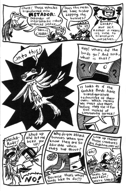 If you’re going to do an anime series, it’s only a matter of time before you get to the part about the smaller robots forming into a giant robot body. Kids, ask your parents (unless they still make Voltron and similar things, I have no idea). This issue is theoretically dedicated to Maribelle Mellonbelly (the richest and most popular girl in school), as she tries to find out more about her newest crush, Hakata Soy. Regular readers of this series will remember Hakata from the last issue, and this time his role as the head of a giant robot is examined in more detail. Another girl tells Maribelle the story of how Hakata (along with his other buddies in robots) saved her village and all of the bunny people inside of it by fighting off an evil group of invading bird people. Once again the dialogue is absolutely perfect, and meant to be said out loud with an exclamation point! If you’ve never seen anime that won’t make a lick of sense, but trust me on this one. If feels like Teen Boat got most of the love on this page, but this series is fantastic, and going back and reading the early issues has helped drive that point home. Get these in their collected editions or get them in the regular issues, but the important thing is to get them. Unless you hate anime, but even then (as I’m not a big fan) there’s plenty to like about this series. $.75