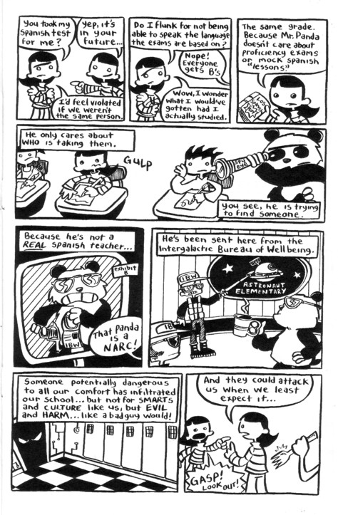 Time travel! Violence! A panda for a teacher, and on the day that the heroine wears her panda hat, no less! And, of course, a villain! All these things add up to the plot of #4 of this series, such as it is. Sorry about all the exclamation points, but this series just makes me giddy. The dialogue is very true to anime, or at least the anime I’ve seen, and I love the constant random goings-on. Don’t try to puzzle out the whole space-time continuum problems with there being multiple versions of the same person in here though, your head might explode. Good stuff as always, there are also collections of these issues now up in the online store for those of you who like their Astronaut Elementary in neat little packages…