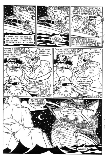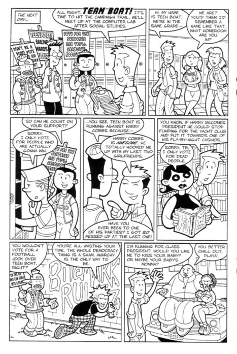 Is this the end of Teen Boat? Who knows, but I sure hope not. How’s that for an evasive answer? This one, as you can probably tell by the cover, is all about Teen Boat deciding to run for class president. My favorite sign had to be “Vote for the schooner and you’ll graduate sooner!”, but there were more than a few good ones. Oh, and I should also mention that he’s running against the most popular guy in school who also happens to be on the football team and throws great parties. How’s that for drama? Good stuff again, as if that’s a shock to anybody who’s been reading this series.