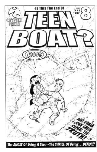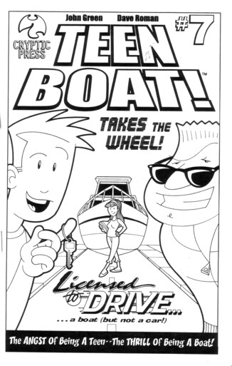 All is well in the world again, as not one but two Teen Boat’s I’d never seen arrived in the mail today. They’re twice the size of the old Teen Boat’s and this one even has a cliffhanger ending that’s, well, spoiled a bit if you scroll down and check out the cover to #8, but oh well, that’s a spoiler I can live with. As for this issue, Teen Boat learns that the only way to a woman’s heart (at least in high school, insert snarky comment about adult women here if you wish) is through the ability to drive a car, so he takes steps to learn these skills. Naturally being out of the water is not something that comes naturally to young Teen Boat, but he’s able to learn what he needs to know and even has the driving test going smoothly. At least he does UNTIL… I can say no more. But what needs to be said? Who doesn’t know by now that Teen Boat is one of the goofiest, funniest and downright cheeringupingest books in the world? #7 ranks with the best in the series, and after seeing that cover I have the same high hopes for #8. It’s a bit pricier than the old books, mostly because it’s huge in relation to #1-6, and the old books were ridiculously cheap to begin with. $2