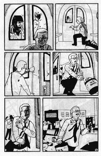 If there was one name that was repeated to me over and over again from all corners of the small press world, it was Dylan Williams. Everybody said that I just had to put him on my page, that his Reporter series was possibly the best mini going (depending on who you ask). So, naturally, I had extremely high expectations for this, and I’m sorry to say that they weren’t met, at least not in this issue. It’s the story of an armored car robbery, with a slight twist: it’s a silent issue. The previous silent comics that I’ve seen were pretty slow and the silence accentuated the mood. It’s a bold move to make an issue about a robbery silent, but it just didn’t work for me. I read it twice today and I still don’t know exactly what happened. I think I finally figured out where everybody involved is now and some of what happens, but it’s still kind of a blur. Were parts of it flashbacks? Which parts? There aren’t any breaks, and it’s really hard to tell what’s happening when. I feel like there’s one simple element that I’m missing to bring the whole thing together, but until I figure that out this issue is going to remain a disappointment. Keep in mind, though, that I’m still going to buy the other issues of this series, mostly because everybody thinks so highly of him. And, I feel obligated to point out again that I’m the only person out there who doesn’t think of this guy as the Jesus of the small press scene, and that’s based on one short, silent issue. To say that he’s not worth checking out is ridiculous. All I’m saying is that this isn’t the issue to start with. If I experience a moment of absolute clarity and this whole thing comes together, I’ll let you know and apologize for being a moron. Until then, go with one of the earlier issues and see what you think. E-mail the man or send him $3 for a sample issue at: PO Box 10952 Portland, OR 97296-0952.