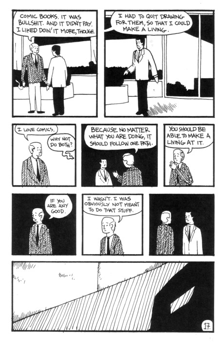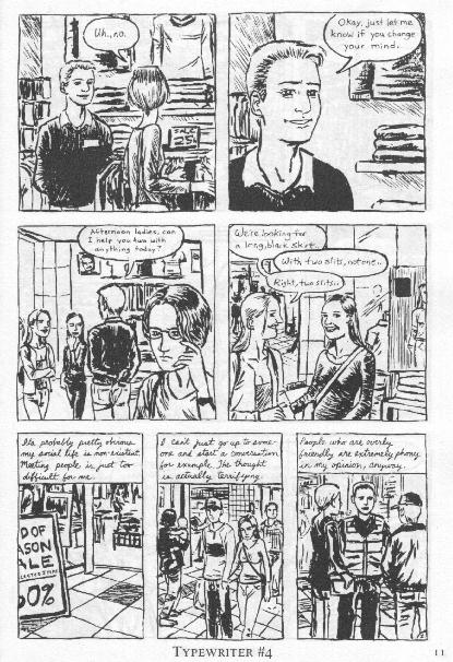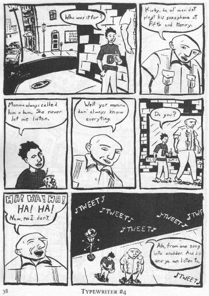 Before I get started, let me make one thing completely clear: this book is beautifully done. I don’t know if you can tell from that scan or not, but the cover was completely hand-sewn for each issue, with a different pattern on each cover. The toughest part about buying it was deciding which cover I liked the most. David couldn’t even tell me how long it took to put an issue together because he said it was a process that had many steps. That’s dedication, folks. I should also mention that his girlfriend (?) Nami Biggs designed it. Anyway, the actual comic. It’s good stuff, an anthology with a couple familiar names and a couple of unfamiliar ones. Really, if the pages were all blank I’d still say that you should buy this for the cover alone, but the stories range from good to great. I think I might have misjudged Dylan Williams too, if the one issue I read was a tiny part of a much greater whole like this story suggests. Hey, I’ll change my opinion when I read more of them, OK? David’s story is the longest in this volume and is projected to be much longer. It’s good so far, but I like seeing the whole thing with stories like that. Other names include Chris Wright, Scott McKibben, Jonathon Russell, Michael Bonfiglio, Michael Hall, Carrie Golus. and Lance Simmons. Contact info for all is included and, seriously, get a copy of this. You won’t regret it. E-mail David, I’ve heard that #5 is out now too.