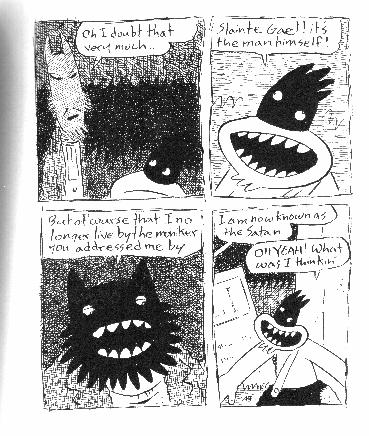 There are some reviews that just write themselves. Look, I’ll give you the part of the lineup (that way part of it is still a mystery!) for the anthology, OK? Neil Fitzpatrick, Souther Salazar, Josh Simmons, Paul Hornschemeier, Marc Bell, Dylan Williams, and Scott Mills. The idea here is that everybody picks up after everybody else, in whatever manner they see fit. For example, Dylan Williams has a short story about a man in a bar, complaining about music, until he sees “Me and My Demon Speeder are Gonna Win This Race” written on the bathroom wall. Marc Bell picks up right there, with a character that only Marc Bell could draw, in a race, on something that looks like a demon speeder. Some of the transitions are smooth, some of them aren’t, but this book is a tremendous experiment regardless. Yes, I know it’s been done before, but this book is $10 and hefty, so it’s nice to see it being done on a larger scale. My only beef is that the pages aren’t marked, so it’s hard at times to tell what artist is drawing certain pages. Still, a minor thing, and something that could probably be remedied with a trip around my website, looking at samples from everybody in it, if only I wasn’t so damned lazy. Here’s hoping the contact info above is correct, it’s the only address I have…