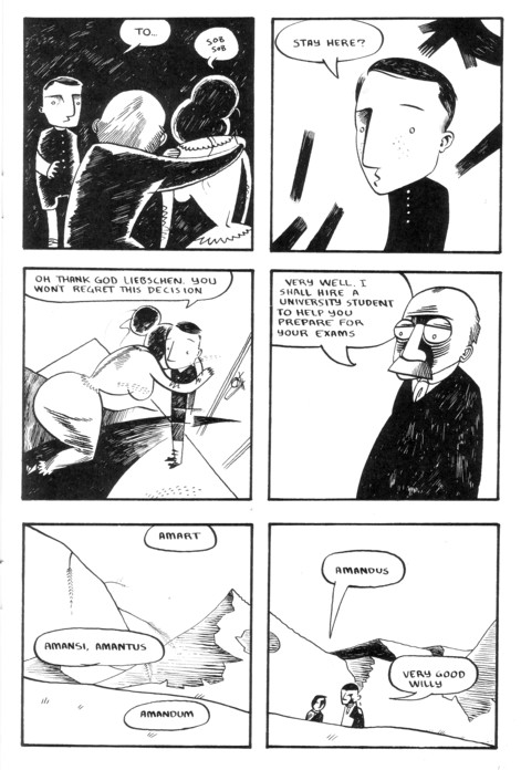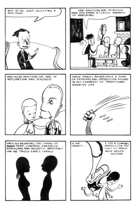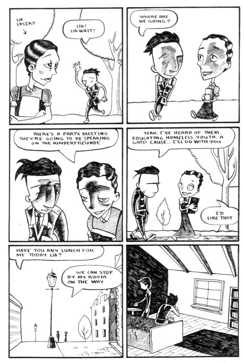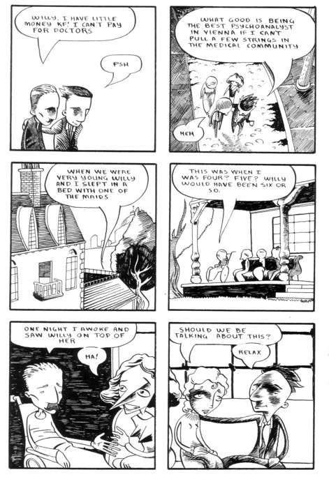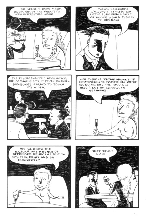 Ho-hum, another excellent issue. OK, maybe I’m not actually bored by excellence (as you can tell if you notice the short amount of time between updates to this page), but I’m running out of superlatives over here. In this issue Wilhelm basically lets his marriage dissolve (as would make perfect sense if you read about his general theories on this sort of thing in past issues), gives Freud a thorough listing of what he’d like to accomplish with his sex education (and oh, what a better world we’d have if we’d listened to him back in the 30’s), and chats with some colleagues at a bar. Oh, and Hitler is appointed Chancellor of Germany. There’s a cliff-hanger for you! Wilhelm has to decide whether to stay and fight or leave, and this is all on top of the Communist party (who he had allied with) essentially disowning him for his views. Sadly, very few places are as progressive with his views on sexuality as he was even now, 80 years later. If you’re not already reading this series, pick it up already. I don’t know how I can convince you. You read comics, or you wouldn’t be at this website. You prefer the good ones, or you wouldn’t be digging through the piles of small press stuff available here. Here it is! One of the good ones you’ve been looking for! And yes, I would be saying that if I wasn’t selling it. Buy it from the Sparkplug site for all I care, but it deserves a huge audience. $4