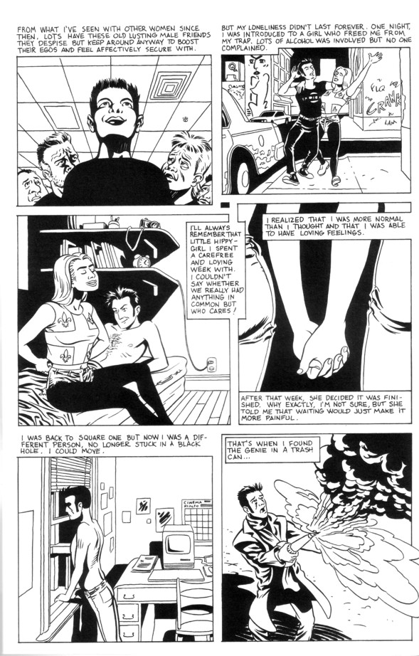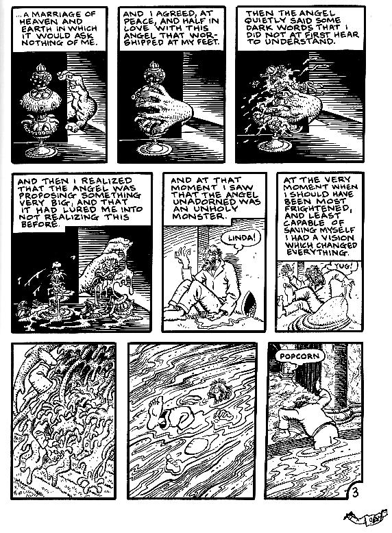 Damn it all. I was under the impression that this book was the first issue and that I would be able to start off fresh. Turns out that this is #4 of the second volume, so he’s been at it for a while. Still, I must be doing OK if my worst problem is that I have to see what happened before this, and even that isn’t absolutely essential because the story doesn’t seem to have been continued anywhere. I mostly just want to because I liked the comic. Eric wrote to me almost write away many months ago when I first started Xerox Army and has been nothing but good people, so I’ve been preparing myself to be impressed with this for a while now. I should have broken down and gotten other issues before this, but this whole “being too poor to eat” thing really limits my options these days. Anyway, enough of the rambling. The first story in this sticks with me the most upon reflection. A man meets Veena in a bar and tells her about how he’s been reliving his life over and over again with the help of a genie, but he just can’t seem to get everything quite right. Great finish to this. I wish I knew the background to this character though. As far as I know all she does is sit in bars drinking. Cold Fluid, about a Captain America like guy hunting down Frankenstein to help him live longer, hearkened (can I use that in this century) back to the EC Comics days, except for the fact that the hero doesn’t do so well in this one. Oh come on, I didn’t give anything away. You can tell all that from the first page. Lots if little pieces in this too. A running serial with a man trapped in Hitler’s body (also goes back to the pulp days of comics), some dream stuff and a story about the “future”. A well-rounded book, all kinds of good stuff in here. I would have liked a little more Veena, so I guess it’s my own damned fault for not having more of them. I’ll fix that soon enough. This is a full size comic, so you should be able to find it if you have a halfway decent comic store anywhere near you. If not, visit his website for ordering info.