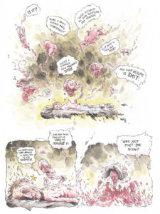 Once again I’m going to cheat a bit and quote directly from the disclaimer on the back of the book: “This book is not recommended for children or the self-satisfied.” That might seem to be a confusing description about a comic dealing with a sickness, but boy does it ever make sense after you read it. This starts off as the story of Gabby (aka Ken Dahl) as he deals with a sudden illness. He starts off with the same plan as everybody with no health insurance: wait it out, drink lots of fluids and hope for the best. But his illness keeps getting worse and worse, so he finally breaks down and heads to the local emergency room (despite that same emergency room being recently sued for letting somebody die in their waiting room after leaving them there for 24 hours). 22 hours into his stay he gets in to see a doctor… who doesn’t help him out even a little bit. From there he goes back to his original plan of waiting it out, even though it had clearly gotten pretty terrible for him to head to the hospital in the first place. But as the days went on and he didn’t get any better, he started pondering the reasons for living, and what was or wasn’t worth fighting for. From there he thought of all of human history and the delusions that we all must tell ourselves to enjoy our lives in a place of such rampant corruption, disease and hopelessness. He came away with a damned near irrefutable case against humanity in all its forms, unless you were willing to stick to that plan of willful ignorance, but you can read this yourself to see the case that he made. Granted, his mind was in a sick and dark place when he thought all this through, but I defy anybody to read this without agreeing with a good chunk of what he said. If you’re content in the bubble that you’ve made of your life and have no interest in seeing if anything could break through, stay away from this book at all costs. If you can accurately see your surroundings already and want to live as closely examined of a life as possible, there are few books better than this to help in that task. $21.95