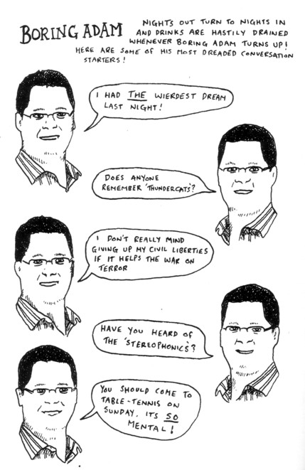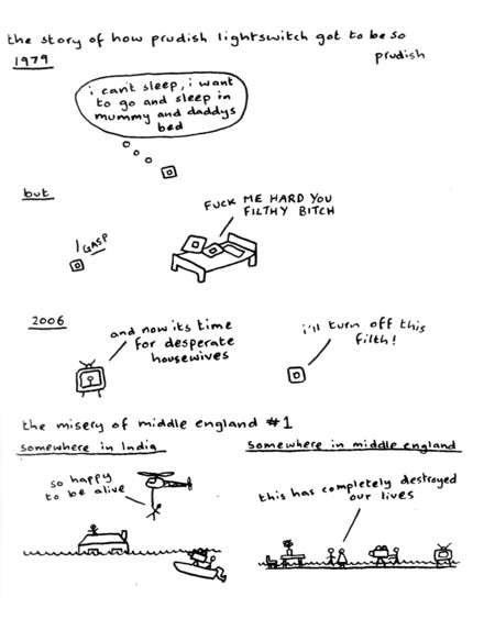 Any of you comics folks out there who are convinced that what you’re doing is as minimalistic as it gets, please take note of Gareth Brookes. In this comic you will find a series of brief conversations and/or jokes, usually between Man Man and himself, Man Man and Woman Woman, or an electric plug with either itself or the wall socket. There are no backgrounds, no facial expressions (or, conversely, faces), and very little at all outside of the basic lines necessary to make objects. Luckily that’s not a bad thing in this case, as pretty much the whole thing is funny. There’s something in here for everybody, whether it’s the secret shame of making fun of a fat lady to impress your friends, trying to reach that magical “drunk enough to have sex but not so drunk that he/she’ll get sick all over the place” threshold with a date, showing no fear to a dog, or shattering the dream of being a pornstar. Gareth sent me a hefty pile of comics with this so my opinion will become more informed over time, but for now there’s always room for one more insightful, funny guy in the world of comics. It’s from the UK so I’m not entirely sure on the price, but judging from the way the dollar is going I’d say just send him a pile of money and hope for the best. Or you could just check out that handy website linked above…