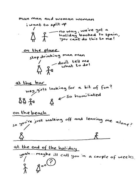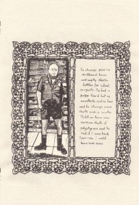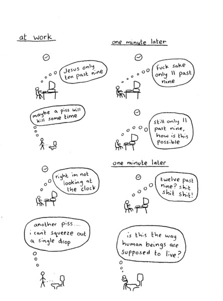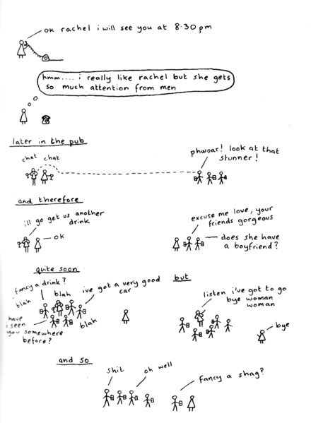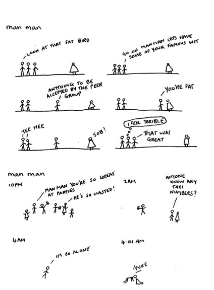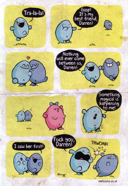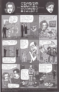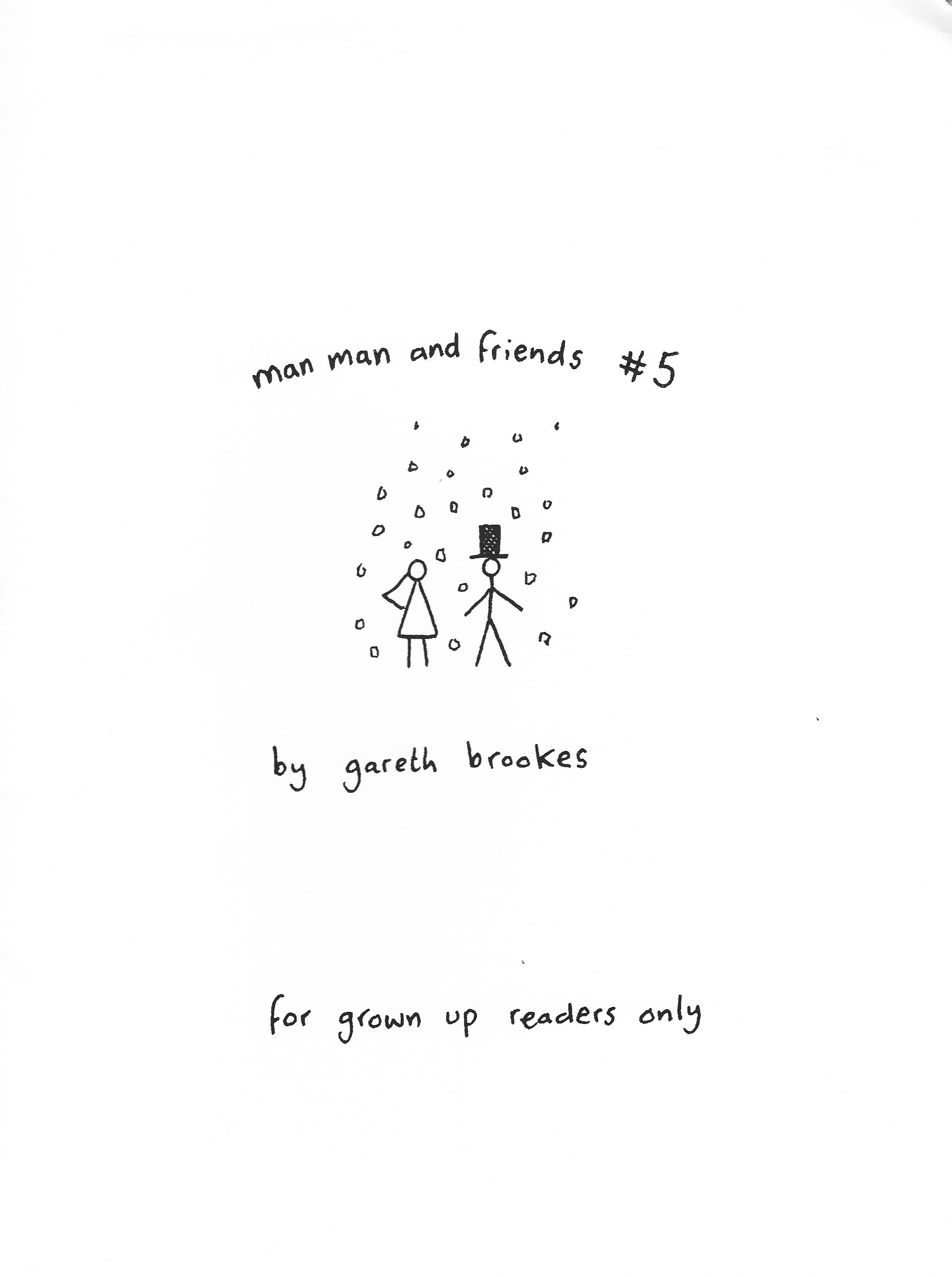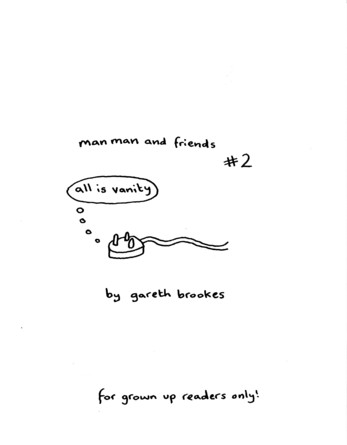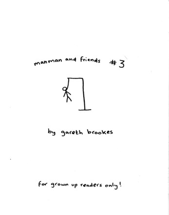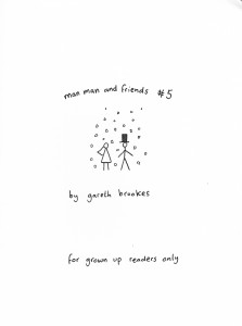 It’s a testament to Gareth’s skills that he’s able to keep this series fresh and interesting. I mean, a stick figure man and his friends, talking about life and relationships, and managing to never get preachy of annoying? That’s takes talent. Once again I had a hard time picking out just one sample, and once again I laughed out loud more than a few times. Stories in here include the shitting ghost getting startled, man man deciding to make woman woman instigate sex for once, a couple of hilarious bits about things his mother said when he was a kid versus what she says about the same things now, trying to meet up outside a mall when they all look exactly the same, ra man “saving” a party with weed, Mr. Shit, unhappy lawnmowers, and one of the pitfalls of speed dating. There’s also a page where Gareth draws things that are not stick-related (it turns out he’s quite good at it) and quite possibly the highlight of the strip: the vicious triangle of alcohol, work and women. At this point I’ve been talking up this series for years, so at least a few of you have already checked out his work, but for those of you who haven’t: send the man some money and buy some of his comics. It’s stuff like this that made me want to do the website in the first place. He also sent along a couple of “regular” mini comics, which I’ll be getting to in the coming weeks. They can’t possibly be as funny as these minis… right?