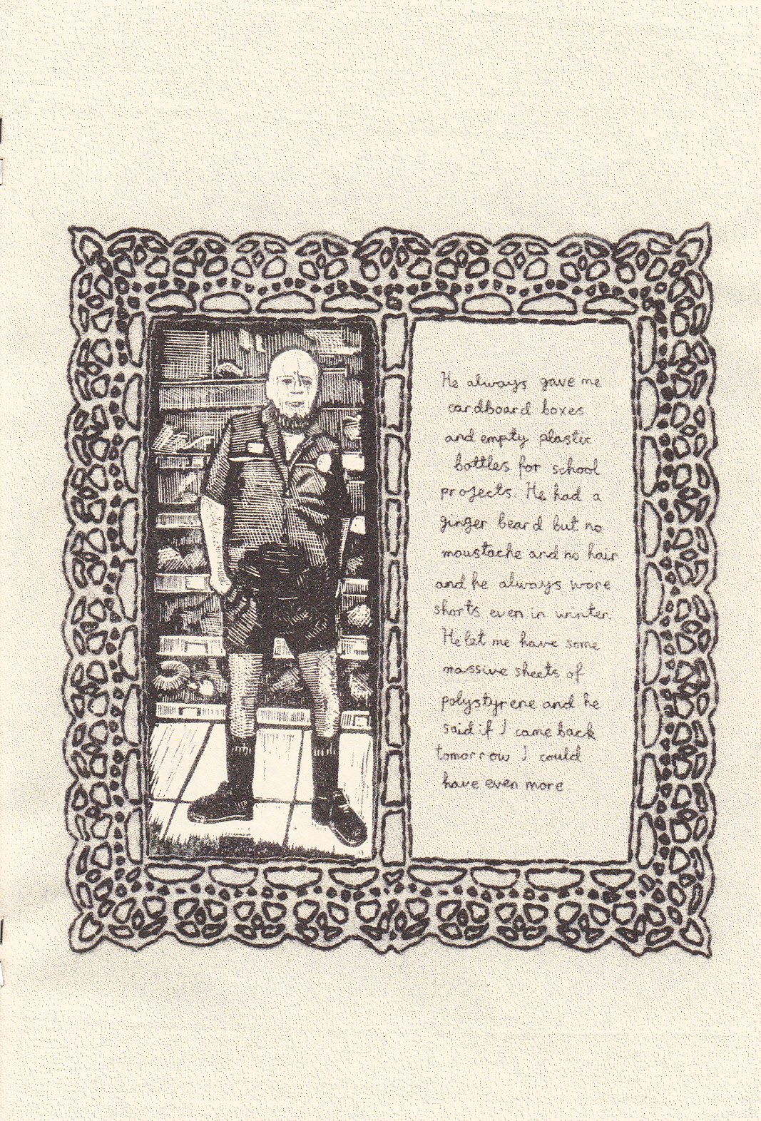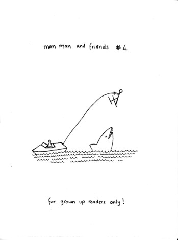 Chances are that you’ve never wondered what goes on at a cardboard box factory. Actually, it would probably be called a recycling plant, as they smash cardboard boxes into little cubes and send them out, but the point remains the same. Gareth, with his uncanny ability to turn everything comics-related he touches into gold, manages to make a completely engaging story out of it. The story begins with Gareth taking in his surroundings, improvising for some breakfast (unless you think porridge in a stale ice cream cone is normal), and avoiding a conversation about football on the way to work. Once he gets there we need a list of the people he works with, and he doesn’t disappoint, telling us the stories of his three main workmates: Ticking Time Bomb Tom, Sleepy Roberto and Frightened John. From here Gareth also mentions other regulars that show up, the daily rituals that come from every mundane job in the world (like the daily eating contest, always involving the same people, food and winner, who always uses the same technique) and the daily appearance of the one woman who always walked by the factory at the same time of day. She was a plain woman, but most of the people in the factory had fallen in love with her anyway. It’s a thoroughly engaging “day in the life” type of story, as Gareth proves once again that he can make anything entertaining. The sample isn’t really representative of the style of the comic, as mostly it’s text on the left side and images on the right, but hey, this is a comics website after all, so I had to pick one that fit the “regular” comics standards. No price on this hefty thing, I’m guessing it’s around $5 US. And if you haven’t seen the rest of this page, you can’t move along without at least looking at Man Man…