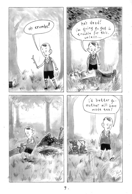 Ladies, leave the room for this one. Granted, you could probably read this and get quite a few laughs out of it, but this is really for the guys who read Boys Life (or the U.K. equivalent) when they were growing up.  From that fantastic front cover to the fake ads in the middle all the way to the airplanes on the back cover, this thing rings all kinds of memory bells for me. The fact that it’s often hilarious doesn’t hurt a bit. Some of this, frankly, will be lost on the American audience, but there’s more than enough to make up for it. Case in point: the introduction by Major General Sir Henry George Gordon Neville Balfour II.  From there you go to a poem about Englishmen (and I, never a fan of poems, think this is the weak part of the comic), a word search (that actually looks legit), a fake ad trying to get young boys to enlist, a comic about a young boy who accidentally kills a tramp, a fake ad proclaiming that “Self-Touching is Bad!”, how to skin a rabbit narrated by… Phillip the Rabbit (one of the creepier/funnier things in the book), a comic about fishing and the language that fishermen use with their kids, how to tattoo yourself, a story that answers the question “What the devil do women want?” (“attack a fellow” being something that is always a good idea), a fake ad about how to hypnotize women (a requirement in these magazines as a kid), a maze guarded by Chinamen, a text piece about an escape from a jungle (with much more going on at home), and an A to Z of useless knowledge. There are also the Stupid Boy! strips that punctuate the comic, always ending the same way and yet somehow always funny, and a vision of your future involving your head being grafted onto a giant robot body.  In short (although it’s too late for that), this comic is loaded. You’ve already seen plenty of Gareth’s work on this site, and if you ‘ve enjoyed it chances are you’ve clicked through and read even more of his work.  This, as a whole, ranks right up there among his best. No price, but it’s probably somewhere in the neighborhood of $5.