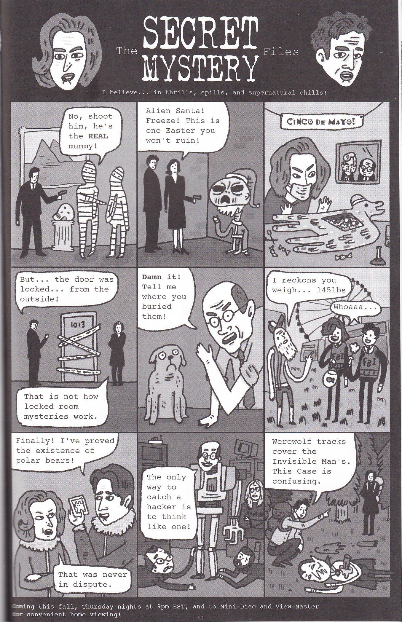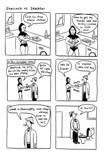 I feel for anybody reading these reviews every day and trying to get some sort of consistency out of them, I really do. One day I’ll say never to judge a book by its cover, and the next I’ll get something like this in the mail, see that title and “Gareth Brookes” on the front, and it will be clear quickly that the cover won me over completely. Ah well, consistency is for the weak! This is, as you may have guessed, about the feud between Sherlock Holmes and Skeletor. What, didn’t you hear about that one? If you’re looking for apocalyptic action as depicted on that cover you might be disappointed; if you’re in it for the funny you’re going to go away very satisfied indeed. This is a series of pranks between the two, um, “men”, and it took a few pages for me to get that Holmes even knew that Skeletor existed. It seems a shame to spoil even one of these pranks by revealing them here, but as a reviewer I suppose that the spoiling of fun is, like it or not, in my job description, so here goes: potato, Aniston, “it burns”, wattage, poo, cheating, birds, and an infernal contraption. There, that seems vague enough. Look, if you’ve been reading this site for any length of time you should know that getting a book from Gareth Brookes is as close to a sure thing as you can get in this medium. If not, search around a bit and check out some of the older reviews. Really, all this rambling is irrelevant, as one look at that cover should be enough to convince you one way or the other. If it’s the negative way I mourn for the lack of fun in your life, if it’s the other way you won’t be disappointed.
