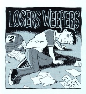 Are you the type of person who picks up random scraps of paper if you see that they have handwriting on them? How about journals or notebooks that you see lying around? I’d answer “yes” to each question, provided that they’re not laying in a puddle of gunk or something equally nasty. J.T. uses a couple of found items as launching pads for a few stories, fitting nicely into the “tragi-comic” theme he mentions in his intro. First up is a journal that he found and decided to keep because only a few pages had been used. But those few pages… hoo boy. He’s also nice enough to reprint the entries in legible writing, and kudos to him for that, or this would have been a whole lot tougher to follow. The gist of it is that a young woman is dating a guy and doesn’t know how to get out of it because the guy is not all there mentally and she’s sure that her leaving will devastate him. Then there’s another entry much later (when she’s much less concerned about what’s going to happen to the guy) and one final entry dealing with her moving to a new town and having a hard time making friends. The story for this one bleeds into both of the other stories, and they involve a set of wildly offensive lyrics and one garbled note about watching a wallet and “borrowing” some coke. All of these elements end up jumbled together and we get a story about a new relationship, running into an ex on the street, an open mic night involving those lyrics, and the potential meaning behind that last note. It’s a combination of stories that could have fallen apart pretty easily, but J.T. makes good use of the material and crafts and pretty compelling piece about it all. There’s at least one more issue in this series, and I’m very interested to see if he can pull this off twice, but this issue was solid. Entertaining, darkly funny at times, and yeah, a little tragic. $5