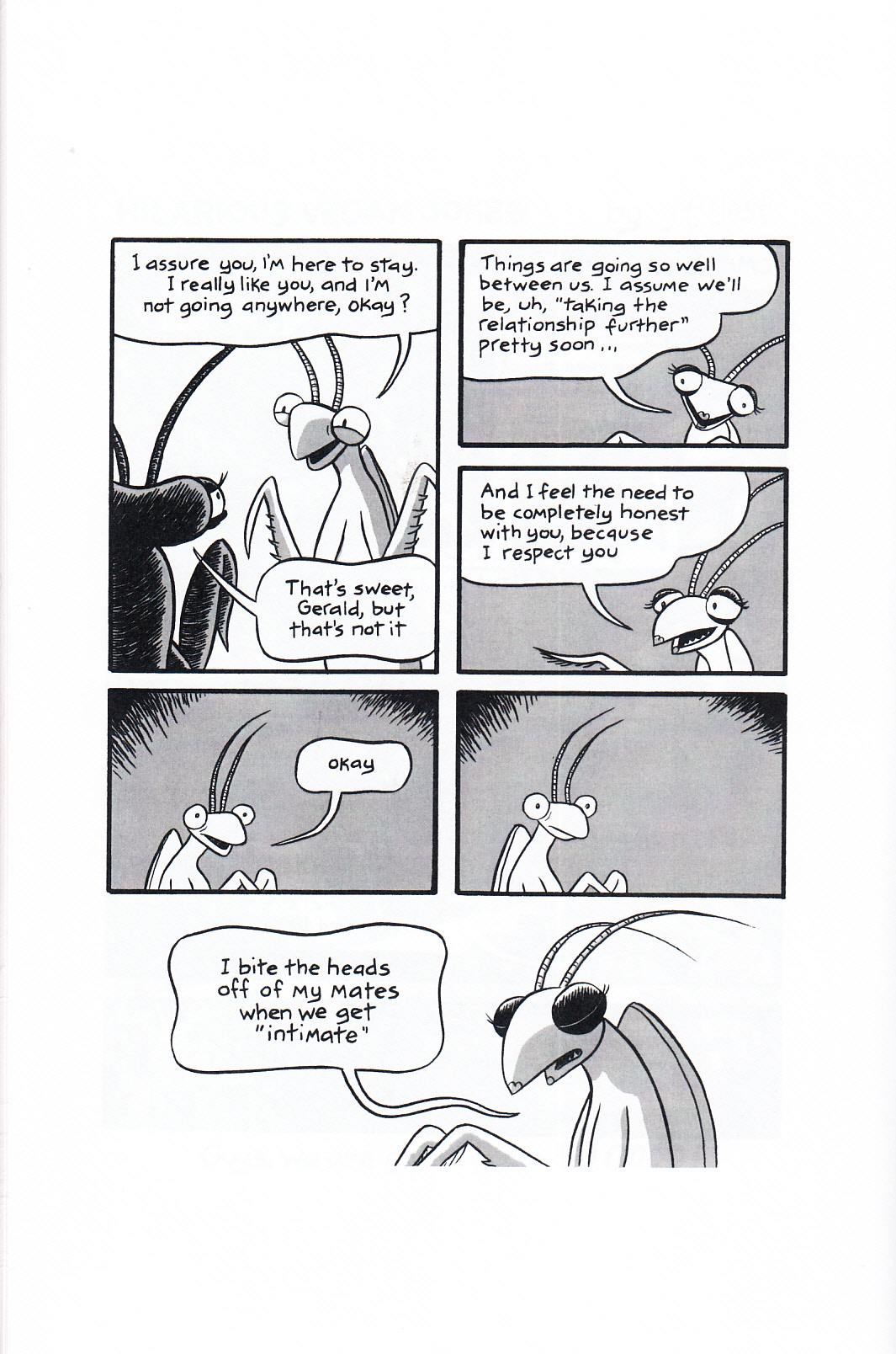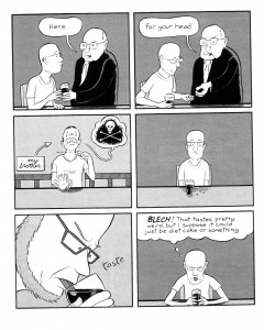 Just so you know, the title makes a little more sense when you actually read the comic. Not much, but a little. This is a collection of short pieces that J.T. has done for various anthologies for the last few years, so if you track down every single one of his stories, you may have already seen them. Well, except for the first story, as that is unpublished (at least as of the publication date of this comic). For everybody else, this is a nice mix of stories. First up is the story of his odd habit of curling up his tongue when confronted with something too cute, to help prevent himself from hugging or grabbing said cute creature too tightly. I’ve never heard of this, but am equally confused by the reaction of people confronted with overwhelming cuteness who proclaim their desire to murder said cute creature in various horrible ways. Next up is the mysterious case of the lead masks, which I read in another anthology, making this the only story in here that I’d seen before. For everybody else, it gets into two men who died mysteriously with no signs of foul play, mysterious journal entries leading up to it and all kinds of weird theories as to what may have happened. From there we get a short history of the mohawk, followed by the angst of a female preying mantis as she tells her partner what is going to happen to him when they have sex. Next is the “you should take some drugs while reading this” story of the batch, as Little Orphan Annie morphs into the Popeye comic strip, but not in the way you might expect and not completely. Eh, this one you’ll just have to see for yourself. Finally there’s Jon having an honest conversation with Garfield, and Garfield gives him the advice we’ve all been wanting to give him for many years now. There are also a few shorter joke pieces, but I’ll leave those a surprise. I laughed for some of them and didn’t laugh for others, which is how these things usually go, but humor is subjective, so your opinion may vary in either direction. It’s a solid collection of stories, and it’s pretty cheap at $3. You should probably buy it and see what you think of it. $3
