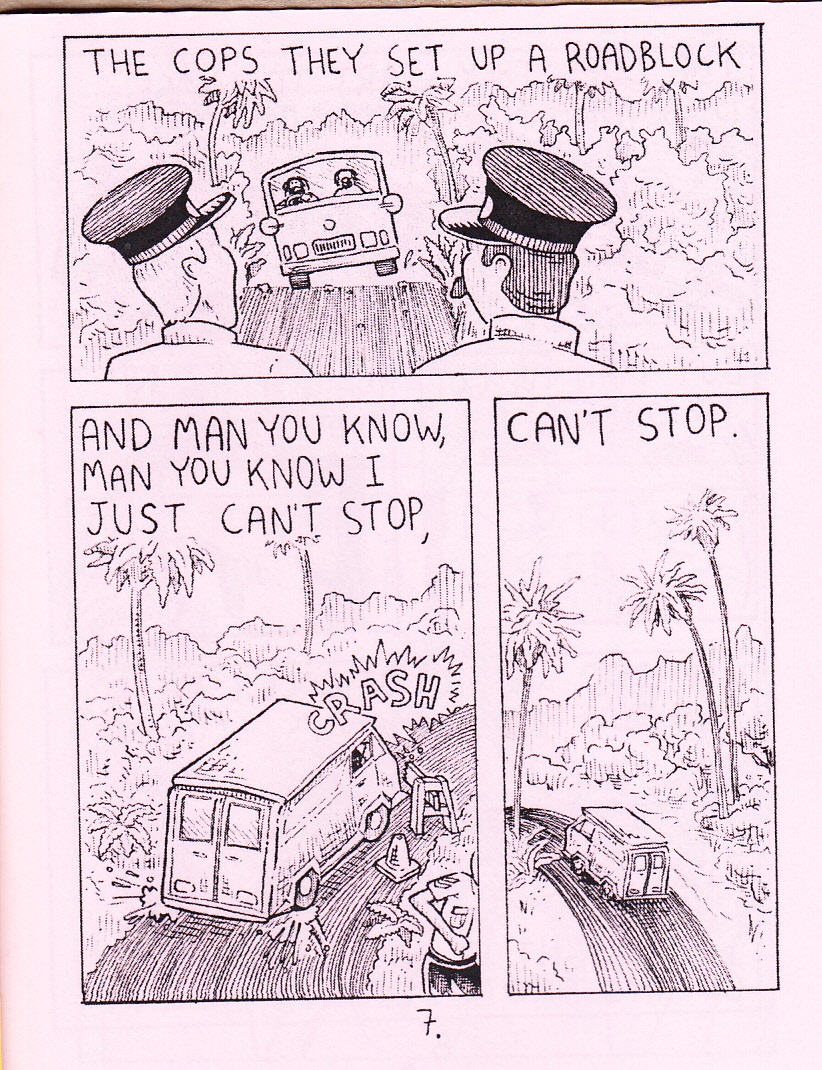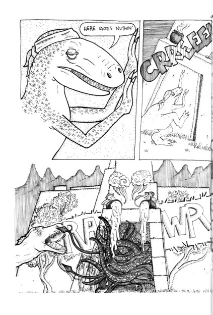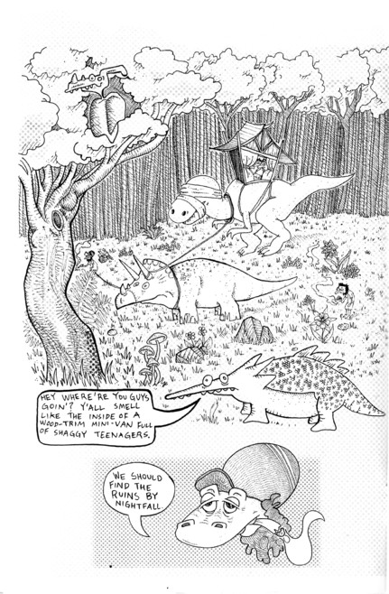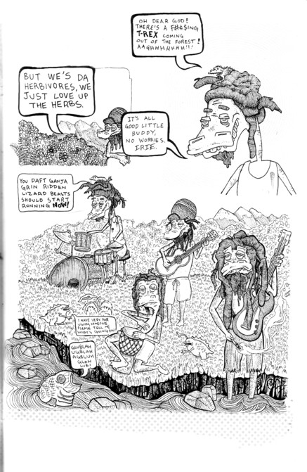OK quick: stoner dinosaur reggae band + a momentarily angry T-Rex = ? I have no idea either, but this comic has a fun time trying to figure it out. Things start off quietly enough (and James does an amazing job with the art on that first page) with the band quietly playing, throwing out a few political slogans. A T-Rex is approaching, and the small parasites next to the band try to point this out, but heavy pot use does tend to dull the reaction times. The T-Rex get a bite of one of the band, the heavy THC concentration makes the T-Rex wander off… until it gets the munchies. Considering the fact that this comic is centered around one of my least favorite things in the world (reggae bands), it’s a minor miracle that I enjoyed this as much as I did. The gorgeous art helped a lot, as the detail everywhere is impressive, and there are more than a few funny bits in this tiny thing. James was nice enough to send the first three issues, so we’ll see if this gets old in a hurry, but it’s a fun first issue, and there’s a whole bunch of comics at that website to get to know the guy a little better. $2