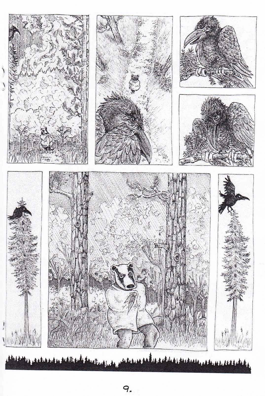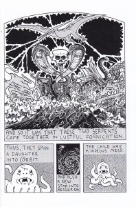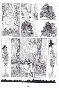Ah, dream comics. They’re damned near review-proof, at least in terms of the story, because what are you supposed to criticize? I can say that it now makes sense to me that James rarely uses humans, as the few unobscured human faces in this one were flat and their mouths never opened, but even that is a petty point to make, especially when it’s always possible that the faces were drawn without much detail based on the dream. So what is the dream about? Ah, this part is always fun. Two girls are out in the dark following a trail only by the soles of their feet, but when they reach a fork in the path a comet comes by to briefly light their way. They find the house that they were looking for, but after knocking on the door a large cluster of ghost crows emerge and light the forest on fire. The girls wonder if they should move away from the flames, but out of the forest emerges what appears to be a badger wearing a cloak and with two human legs. Or is it one large beast leg later on? Again, it’s a dream. This almost excuses me from my pledge not to do spoilers, but not quite, so I’ll leave it there. James has a nice afterword explaining the point in his life when he was inspired to do this comic (the dream wasn’t his, so he couldn’t explain it to the reader anyway) and a few more drawings from that time in his life. If I come across as hating this book, that really wasn’t the case. I loved the wisps from the house welcoming the girls, the transformation of the crows, and more than a few other little touches. As to whether or not you should buy it, that depends purely on your opinion of dream comics. It’s a worthy addition to that field, but clearly this wouldn’t be your best bet if you were looking for a definitively coherent story. $5