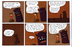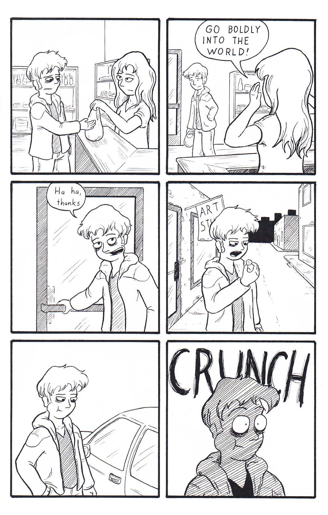 Have you ever had a moment of terror while you were chomping down on a nut, or taffy, or a piece of popcorn, where you heard what sounds like an unusually loud cracking/crunching noise? Depending on where you were when this happened, you might have had to spend several minutes or even hours unable to completely check your teeth, wondering if you had done yourself any permanent damage, with plenty of time to imagine all sorts of horrible changes that would come to your life because of your shattered tooth/teeth. That particular feeling sums up this comic pretty well. It’s a brisk seven pages of comic, in which we see our hero anxiously checking his teeth in a mirror (using the trick of sneaking up on yourself, walking away and then turning back before quickly checking again), explaining to a friend why he’s acting so strangely, and listening to advice from another friend about his obvious need to live a little. It’s a claustrophobic and creepy little book, and it’s hard to imagine this subject matter being covered any better. No price, and from his website it looks like Jeff is reworking some of his comics, but I’d guess that $2-3 would get you a copy of this one.