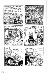 November 2, 2010I wasn’t expecting much of a “theme” out of this. After all, it is “undeleted scenes,” meaning mostly odds and ends from anthologies, notebooks, and whatnot. Still, by the end of it I had more of an impression of his overall life than I’ve gotten from any one of this graphic novels, and that’s saying something. The material ranges from his early days to his having a baby (well, not him, but you get the idea), to the actual raising of the child. Granted, it often came in more of a “drive-by” format, as there wasn’t space to delve into everything in minute detail, but it painted an impressively revealing whole. For all you fans of his work out there (and why else would you be reading this?) , if you own the following comics you already possess the bulk of this collection: “Be a Man,” “Feeble Attempts,” and” Minisulk.” If you just buy the graphic novels and don’t get the individual comics there will be plenty of new material in here for you, although I guess “MiniSulk” was more of a “graphic novel lite,” what with the size and all. Even if you have all of that, you’re still looking at roughly 100 pages of material that’s new to you, and there is some fantastic stuff in here. “Be A Man,” for those of you who don’t know, was Jeffrey’s answer to criticism that he was too wimpy in “Clumsy.” It is a thing of sheer beauty to see him turn all faux-macho for 30+ pages, so that’s worth the price of admission right there. His story about being unable to eat ramen noodles should resonate with anybody who was ever a poor college student, or possibly is still poor now (hey, I bought some just last month!) Then you have his grandma’s reaction to the nudity in his comics (always wondered about that), a lengthy story about bum avoidance and conversations, another weird pseudo-relationship, him almost getting into a drunken brawl (well, the other guy was drunk anyway), fun with medical insurance, and listening too literally to the word of god. And that’s just the stuff that is pretty much guaranteed to be new to you! “Feeble Attempts” was just a regular old comic, so maybe you missed it, but there’s plenty of good stuff in there that now has a home here. Really, at the end of the day your only questions should be “Is this good enough for me to buy” and “Is there enough new material to make it worth my while”? The answer to both of those is an emphatic “yes.” If you’ve never heard of Jeffrey Brown, welcome to the land of the living and maybe check out “Clumsy,” “Funny Misshapen Body” or “Bighead.” You’ll come back to this soon enough, although I guess it may be just a little confusing for new readers (the “Be A Man” stuff in particular would make people think Jeffrey is an a-hole if they weren’t in on the joke), but for everybody else, yeah, I’d say this is required reading. And it is over 350 pages for $15, so it’s a bargain too…