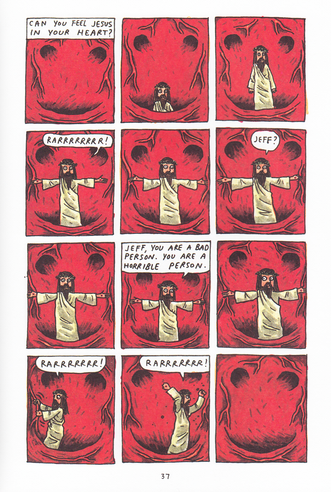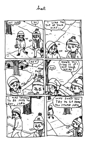 April 22, 2010One of these days when I have a spare year or so I should go through all the pages on this website and list all these book in chronological order. This one came out in April 2005, but I’ve almost certainly reviewed stuff before and after this one before reading Miniature Sulk, or Mini Sulk as Amazon adorably calls it. This doesn’t have a defining, large story like most of his recent stuff, which of course means that I love it. In here we get to see plenty of Jeffrey as a child (including dealing with bullies and his early problems with women, and I sampled possibly his formative moment below), as well as a wide variety of other short pieces. Jeffrey gets punched by his Kung Fu brother, has a crappy birthday, loses control while being tickled, shows some bullies “what for”, gets extremely bored in church, wrestles a fatty, bites his nails, accidentally lets his salamander die… and that’s just the first third of the book. As most of the fun in these things is reading it for yourself, there’s not much point in describing every little thing in here. That’s the thing about Jeffrey: at this point, you know damned well whether or not you like his stuff. And, if so, what kind of books of his you prefer. This one has a bit of everything, including some short fiction in the back, so it’s hard to have much bad to say about it. One thing I did love was how he occasionally showed his younger self with his current stubble to differentiate himself from the other characters. It’s $8 but there’s more than enough in here to justify that price…