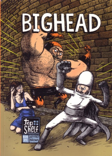 April 22, 2010It’s easy enough to forget at times, in the midst of my gradually increasing “meh”-itude to Jeffrey’s relationship comics (“meh” being somewhere in the middle of the range of possible opinions, obviously), that his non-relationship stuff is constantly the shit. Seriously, if you can find I Am Going To Be Small or any of his non-personal stuff, it’s enough to restore your faith in the concept of comics as being capable of making you laugh out loud, sometimes to the point of tears. Bighead is a collection of all the Bighead minis and various places the character has appeared over the years, and it’s a wonderful, wonderful thing. Here’s the origin of Bighead: repeatedly taunted by schoolmates, Bighead became emotionally scarred, causing his head to swell with power. If that’s not something you can get behind, move along please and leave the funny to the rest of us. Every part of this book is some degree of awesome, from the usually boring page with all the legalese to the last page of Bighead fan art. In between Bighead battles all sorts of villains, ranging from ninjas, a group of his most powerful villains, The Brit (who marries the love of Bighead’s life), Crabby, and The Puncher, among many others. There’s also the unpublished and incomplete Bighead graphic novel, and from the looks of it it’s a damned shame that one never got finished. I’ll leave it there, as it’s no fun to analyze humor to death, but this is just about required reading to any fans left of this genre. $12.95