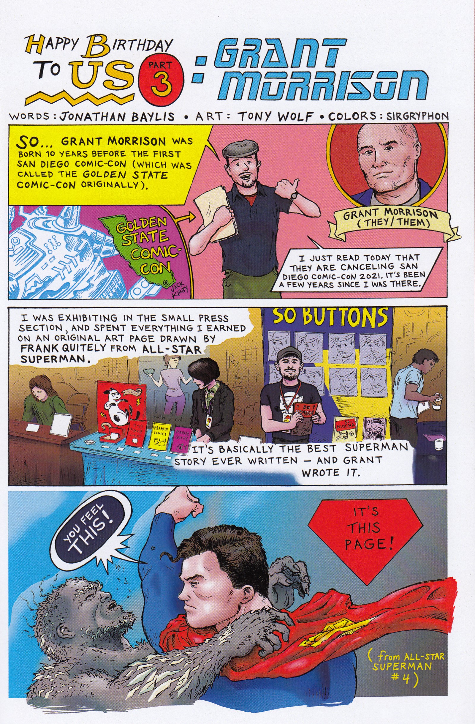 Jonathan has never been nominated for an Ignatz award? Seriously? That seems like an absurd oversight to me. Oh hi, did I already get distracted from my review? Sorry about that, but he mentions that fact a couple of times in here, and it’s ridiculous. But hey, maybe this issue will get nominated next year, because it’s packed to the gills (a phrase I’ve never understood, but never mind that) with winners. First up is the tale of how he settled on his facial hair, how it ties in to Ethan Hawke and what happened when they met (Rachelle Meyer). Next is his memories of sitting with Tom Spurgeon and Carol Tyler at the aftermath of an SPX, which I really have to get to next year (Lance Ward). Then there’s a page by Carol freaking Tyler herself, which is all her, as she agreed to let Jonathan publish one of roughly 100 unpublished pages she found recently. If you were wondering whether or not Kerry Washington was a mensch, does Jonathan (and Ben Passmore) have a story for you! Next up is his story about Grant Morrison, and I have to take a minute here, because it’s about an original page of art he bought from All Star Superman years ago and his debate about whether or not he should sell it, as times were tough during the pandemic. I read All Star Superman literally last week (not for the first time, but in the fancypants “Absolute” edition) and he’s right, it’s the best Superman story ever told, and the only one I’ve seen where the Clark/Superman difference was actually portrayed as big enough to fool people. He also mentioned something I’ve noticed, where I’m roughly 50/50 on Grant’s work, but the 50 on the positive side is VERY positive. But he did this over his own talking head, so now I’m thinking our lists don’t coincide. Doom Patrol in the “bad” pile? Madness (art by Tony Wolf). Josh Bayer draws a true and necessary story about Johnny Rotten, and how inexcusable it was that he ended up a Trump supporter. “The Monkees of punk” was dead on, and if anything maybe a little unfair to The Monkees. Next is the story of a real punk band, Fugazi, his meeting Ian MacKaye and Ian’s story of his time in the crowd at SNL when Belushi wouldn’t go on stage unless a punk band was the musical guest (J.T. Yost). The quality didn’t dip a bit for the last few stories (how could it when Josh Pettinger, Noah Van Sciver and Miss Lasko-Gross were involved, among others) but it’s best to leave a few surprises for y’all, right? Also, I’m going out on a limb here and saying this was my favorite issue of the series so far. Have I said that before? Maybe! But this is the latest issue, so if I have ever said it before, this is the NEW favorite. Pretty good sign when somebody can keep topping themselves like this, huh? Give it a shot, why don’t you? $8