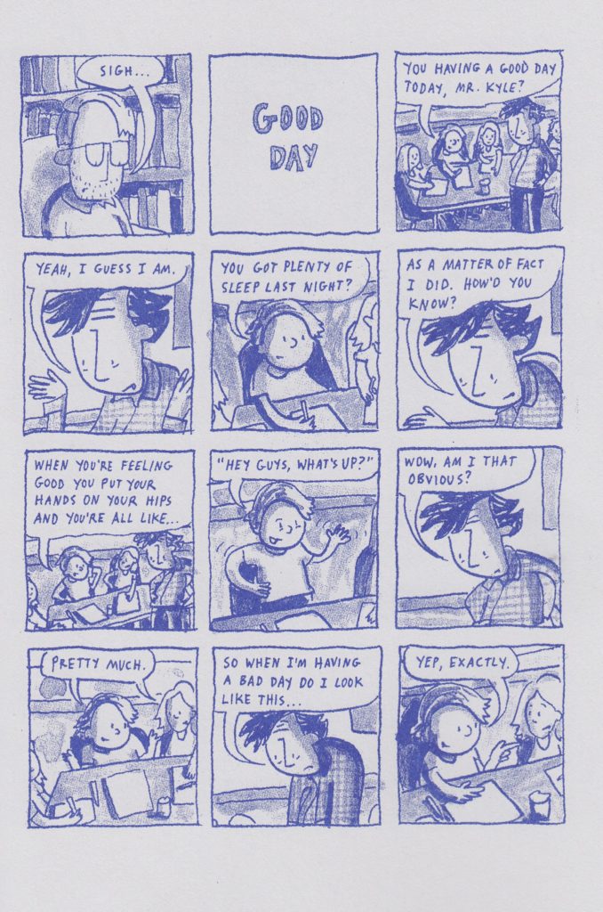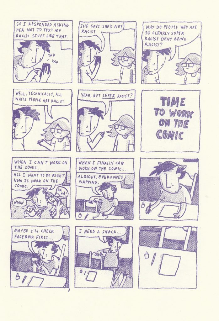 I do very much love it when artists don’t get offended by a past criticism of mine. It doesn’t happen often; the most common reaction when I get a response to something critical I’ve said is thanks, that at the very least maybe I’ve made them think about things in a different way. And sure, sometimes people get mad, as it’s not like I’m going to be right in every thing that I think, and there are even times when I’m having a shitty day and I say something awful in a review as a result. Very rarely, and I’ve gotten better at that over the years, but I am only human. Anyway, long and pointless intro short, I mentioned in the review of Kyle’s last comic that his early drawings “looked like garbage.” Instead of taking this personally, or even giving up because one guy on the internet said something bad about an aspect of his comic, Kyle thought it was funny and even mentioned it in his intro. To be clear, the rest of my review mentioned how much better the book got as he went along, and that sloppiness was an inherent danger of daily diary strips… eh, that’s why I keep an archive here. Read it yourself for the whole story. My point being: artists, never take critics all that seriously. Me, I’m just in it for the free comics. So how about this comic? Kyle has decided to keep going with his strips, but instead of continuing to do them daily (with a small child that’s a dicey proposition anyway) now he just draws them when possible and “as funny or interesting things occur.” That right there should be the motto of all daily diary artists, but then I guess that would take the “daily” out of the equation. Kyle also makes the interesting choice to really maximize space, as strips fill out each page, with them being continued on the next page until they stop. Meaning a strip can be four panels and done or 12 panels and done; once that happens he puts up a title card to signify the start of the next strip to move you along. Environmentalists, shouldn’t you have figured this out years ago? Think of all the paper just this one guy is saving. Subjects in here include the ongoing development of Jamie, having chickens, not having chickens, making a mural, injuring himself, being away from the family, the personal woe of headaches, accidentally getting a faux hawk, and jury duty. It’s some pretty solid storytelling, but the only complaint I have is that after ten minutes of looking around online I’m still not sure where exactly people can buy a copy of this book. The only thing I’ve seen is an Etsy listing that has this for 69.93 SEK, which sounds totally made up. That should always be easy to find for anybody looking for your name. But hey, send the guy an email, that should do the trick too.