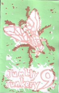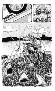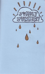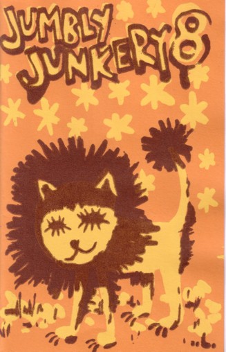 Sometimes this whole art form just hits me all at once. L. had a simple note at the start of this mini, mentioning that this was one of 200 copies of this issue and that there were only going to be 200 copies of this issue ever and really, she’s right. Sure, there might be a collection some day, a “best of” kind of thing, but there are 200 copies of this issue in the universe and that’s it. Then I take a step back and realize that I have boxes and boxes full of comics just like that, one of 100 copies ever made, one of 50 copies, sometimes even one of only a dozen or so copies ever made. That’s what this crazy business is all about right there, the love and dedication that goes into making something with only a relative few copies floating around the world. As for why I’m in a “what’s it all about” mood anyway, I blame L. and the latest issue of Jumbly Junkery. There’s a sense to me that something has settled in her life, although a lot is still less than ideal, and yes, that is totally me pulling these ideas out of a few fictional stories, so feel free to laugh at me. Just a general sense of a slowly dawning acceptance of the nonsense in the universe. As for the actual stories in here not related to my opinions, they include worries about a self-perceived lack of originality, wishing for snow but enjoying warm weather, random items and their potential, having to think about how old you are, realizing that life does not pause when you want it to, the vicious cycle of insomnia, all the skinny people, true love, a recent lack of interest in music, all the people trying not to sleep on a train, a lack of truth, trying to trust in a world of internet dating, dance moves, rain, turning it all off, and Outlaw Dog and Knuckles. The range of artistic styles she chose was impressive as hell too, ranging from the simple to the abstract to cartoonish to certain forms that I believe she made up herself. Her feeling of a lack of originality is baffling to me, as people who always stick with their preferred style could learn a few things here. As for the sample, yes, it has very little to do with the rest of the book, but I could not resist that dog shooting at the shark while jumping over it. Too awesome for words… $5
