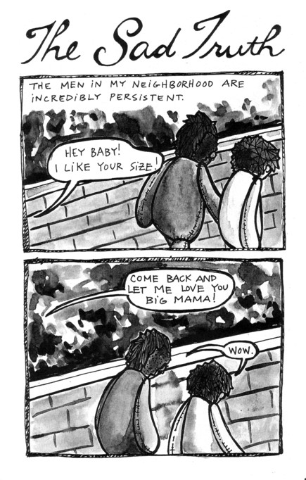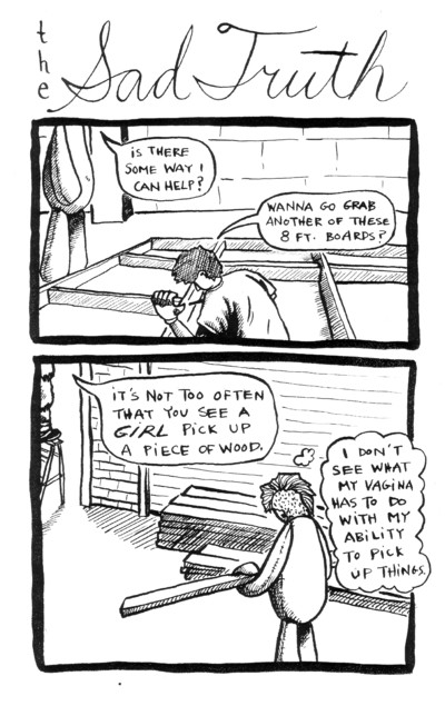 L. adds a few longer pieces this time around, and I think she may be onto something. Granted, I already thought #4 was fantastic, but it’s always nice to see something completely different from an artist and still have it be fantastic. Shows range, don’t you know. There are still one page stories in here, about things like being gassy, public urination, the guard cat, and the daily grind of working. New to this issue are brief snippets about L.’s new love interest (or at least her character in the comic), adorable as they’re only about this new person sleeping. The longer pieces are what shines in here though, especially the biggest one in the bunch, about what to do when a person (in this case, a Muslim) overhears a stranger (in this case, an asshole) making racist comments to you. Do you go go out of your way to tell the asshole off? Do you, alternately, go out of your way to tell the Muslim that you don’t agree with the asshole? Other longer stories deal with the dangers of watching tv, where women are at today, feminism in theory versus reality, a quiet piece of observation, and the persistence of some men who yell at attractive women as they walk by. Oh, and in case anybody is wondering, it’s just a coincidence that both of the sample pages are entitled “The Sad Truth”, it’s not like that’s a constant theme of her comics or anything. just felt compelled to point that out. Great stuff again, if the last issue was $5 I’d say this one is the same.
