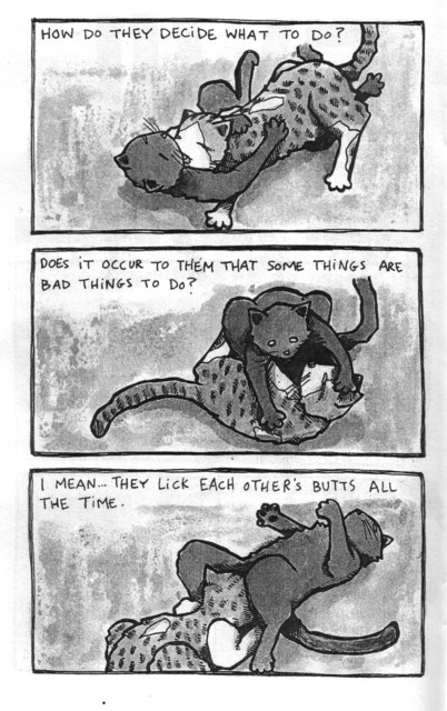 Is it possible for one person to make an anthology? I never thought so, but the sheer range of stories and artwork in this one make me wonder. The bigger pieces of past issues are gone (I think the biggest piece is 3 pages), but variety is the theme for this issue. The “normal” pieces in here include L. wondering if she’s ever going to have the one moment where she joins the sisterhood of women, drinking too much coffee, wondering what makes cats tick (and if they’re inherently good creatures), trying to pick out the things that separate people from animals while walking through a crowd, how Obama easily beats the lowered expectations left over from his predecessor, using cats like skates, whether or not it’s wrong that she loves one cat more than the other, and the thought process of a cat when it sees a box. Mixed in with these pieces are the ones where she’s branching out (and I’m not going to even try to analyze them one by one), dealing with themes such as the unreliable nature of memory, machines as the imperfect perfection of man, happiness, the language of the body, a nightmare, process, and Narcissus. The Narcissus piece was notable because she uses nothing but a collection of short lines to form the whole, it’s a deceptively simple and impressive story. All this and I almost forgot the story at the center of the comic, a color piece about a man who became paralyzed due to his fear of death and was promptly buried alive. It’s an eclectic bunch of stories, that’s for sure, and if you’ve been waiting to check out her work for some reason this one is the one to get. You’ll certainly see a wide range of her talents. And what does it say about me that of all the stories available here to sample, where she uses a wide variety of styles, I went with the cute cat page? $5