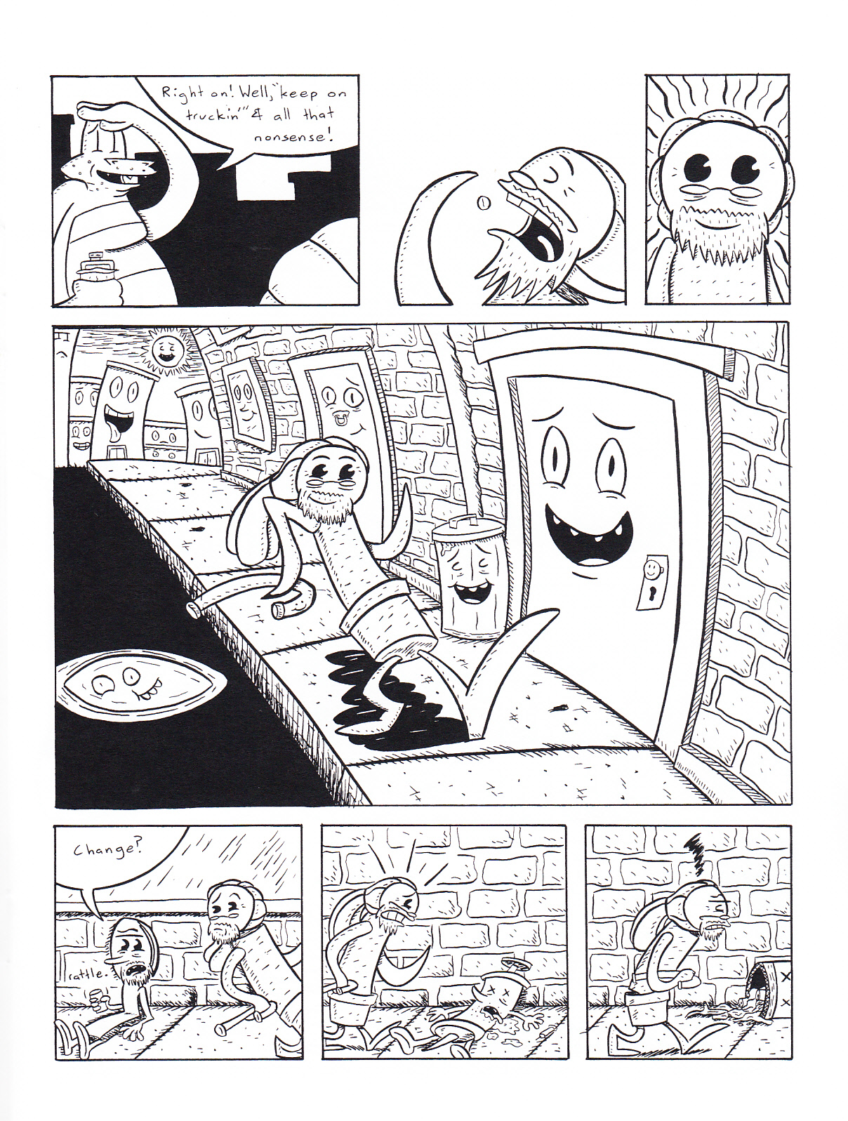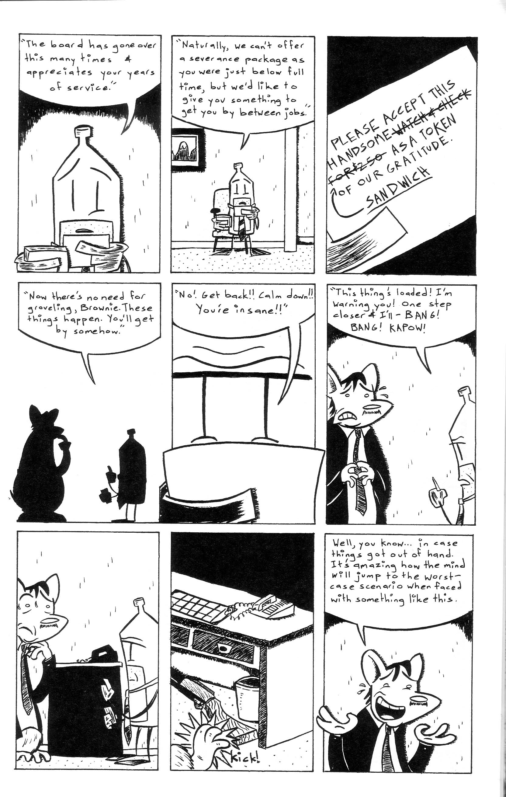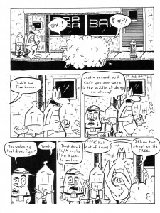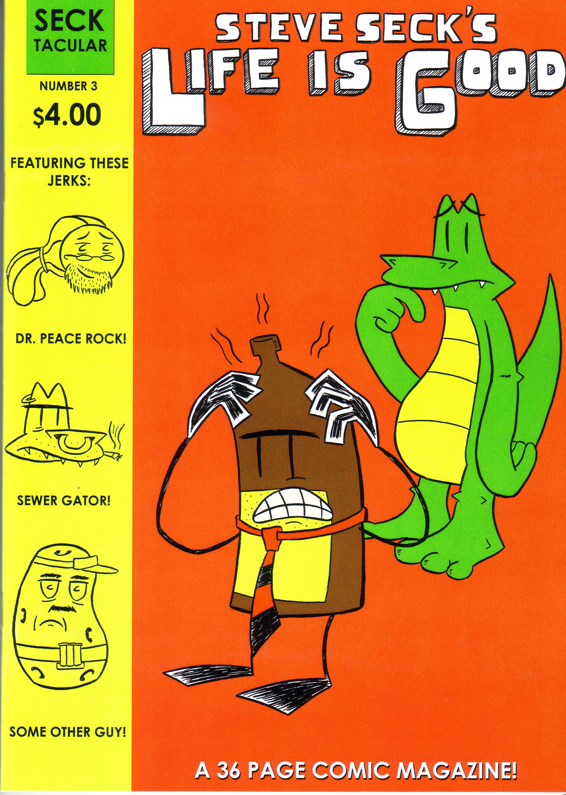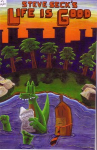 Is this the end for our heroes? I can’t explain that any more without giving away way too much, but this issue ended with a few big things wrapped up and no clear direction moving forward. Which would be fine; this comic has been fun but I wouldn’t mind seeing Steve branch out a bit. Then again, he invested so much time in these characters that I am a little curious to see what he’d do next. Mr. Decisive, that’s me. So how about the specifics of this one? Things start with a very thorough recap (I have just enough of an ego to think that maybe my incessant pestering on this issue is getting through to a few people which, if true, will have made it all worthwhile), then Brownie has a chat with the Sewer Gator about the direction of his comic (which the Sewer Gator stole and published without Brownie knowing about it). Meanwhile, Charles is eating himself to death in his effort to stop littering and Dr. Peace Rock has a plan to pin everything on Charles (and get back in the good graces of Unity). This wouldn’t sound all that strange if it wasn’t for the cast of characters, but there are no actual humans in this comic and even the background characters are odd enough to make you sit up and take note. Anyway, things come to the confrontation that has been coming for issues now, but I can’t really talk about that, so you’ll just have to read it to see what happens. Or if you haven’t read the rest of the series then I guess you don’t have to read it to see what happens, but I think the whole thing is worth a look. Hey, come to think of it, now it’s about the perfect size for a collected edition, and it’s a finite story to boot. I’ve stumbled across his master plan! In case I didn’t talk about the specifics enough this time around (I do have a tendency to ramble about ancillary things), his art has only gotten better and has moved up to “pretty damned good,” and I’d even say that the plotting has gotten tighter. The writing was never bad, but it’s remained entertaining all the way through, and who can ask for more? $4