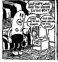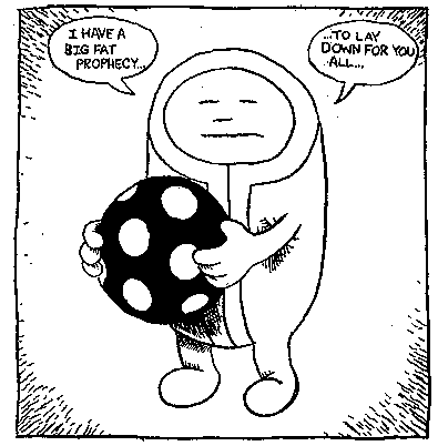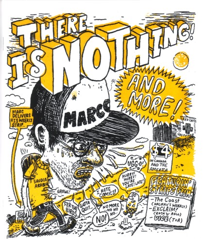 For anybody out there putting together a “best of” collection for any of their characters, this is how you do it. There are strips and stories in here from many different years, letters from fans, Shrimpy appearances in other comics, newspaper strips (some in glorious, glorious color), a cover gallery, even a FAQ. For those of you who have never been introduced the world of Shrimpy and Paul, well, you no longer have an excuse. The pages aren’t numbered, but I’d guess that it’s about 150 pages of great stuff. My favorite story in the universe, “The Ball, the Goose, the Power” is in here, as well as an interconnected epic that involves Kevin, Chia-Man, Saul (Paul’s brother who lives in his nipple), Blimpy, Mushroom Hed, Ib-Ub, Miss Polly, Taco, Mennod, Lucky E., Sanitation Man-Of-Festo, Tim Horton, Goose, Texas Sheriff, Mills, Cubby, Mr. Socks, Captain Beige, Mr. Duck Chocolate, Sue, Jambo Stretch, and Grumpy Man in Small Home. Nobody, and I mean nobody, has panels as intricate as Marc. It would take you over an hour to skim through this book, but everything in it is begging to be examined closely. This is truly one of those books that gets better with every read, as there are a ton of tiny side characters everywhere that you miss if you blink. It’s $16.95, and it’s one of those books that I’d pass out to everybody I knew if I was made of money. The humor might not be for everybody, I guess, if you don’t like things that are funny. As for me, this gets my vote for best collection of the year. Somebody find this man and give him a regular series, or a newspaper strip, or something. Talent like this should be rewarded. E-mail address!