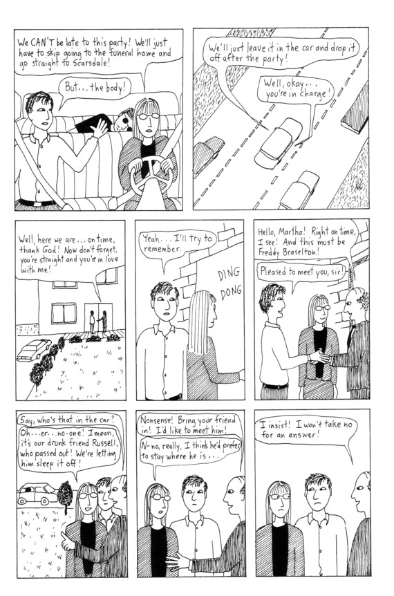 This is one of those comics where I don’t really know what to say. The art isn’t very good, but you can tell that from the title of the book and if the author doesn’t have a problem with it, why should I? I thoroughly enjoyed the main story, The Mix-Up, in this one. Let me try to sum it up for you. Martha gets a job by convincing her employer that she is dating someone when she’s single. She calls on a female friend to help her out for the night, and she’ll hook Martha up with a supposedly gay friend if Martha transports the dead body of her cousin to the funeral home. Things get even more confusing when they get to dinner, and there are all kinds of twists and turns thrown in. It all goes together a lot better than I thought it would and it was pretty funny. How could you ask for more? Pretty much the only thing that I didn’t like were some of the gag strips, as they just weren’t suited to my sense of humor. I think that was what put me off about some of both of these two issues, even though they definitely both had enough to make them worth checking out. They’re done pretty well and it’s obvious that Martha is an extremely intelligent woman, it’s just that they seemed kind of… plain at times. That’s probably a horrible way to describe it, but that’s the best that I can come up with. Regardless, The Dead-End Job, The Mix-Up and some of the shorter pieces were great, and that’s almost the whole book right there. If you’re incredibly worried about the art, you can tell by her website that she has improved over the years. So, even though I can’t point to anything as being that specifically bad and the things I can point to were actually pretty good, I’m left with an impression of “eh”. Maybe because that’s just been my mood all day, I don’t know. That should show all of you who are trying to read these things and expect an intelligent analysis of these comics… Seriously though, go to her site and decide for yourself. There are all kinds of samples there. And here’s a couple from me: